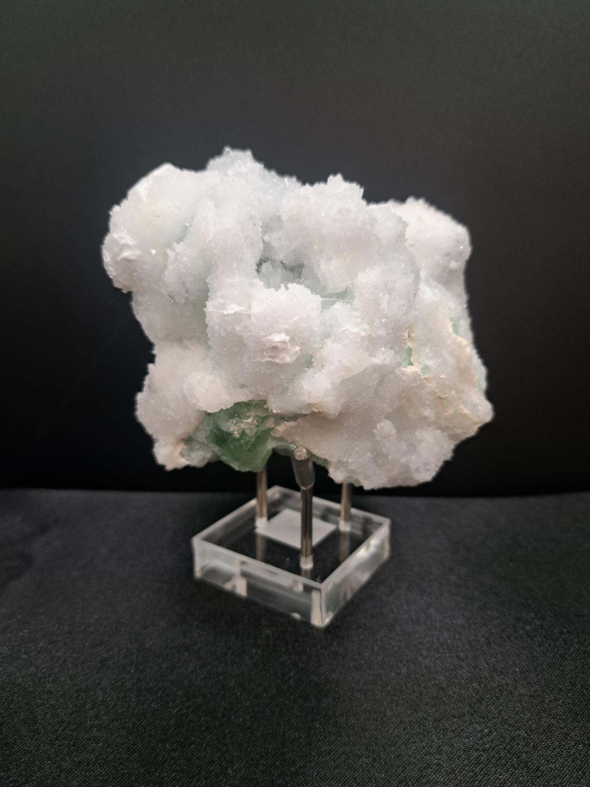 Square acrylic base, has 3 silver prongs to fit your crystal. Great way to display irregular shaped specimens or spheres. Base is 1.5" square, stands 1.75" tall. Example shown is a 3.5" fluorite - not included.