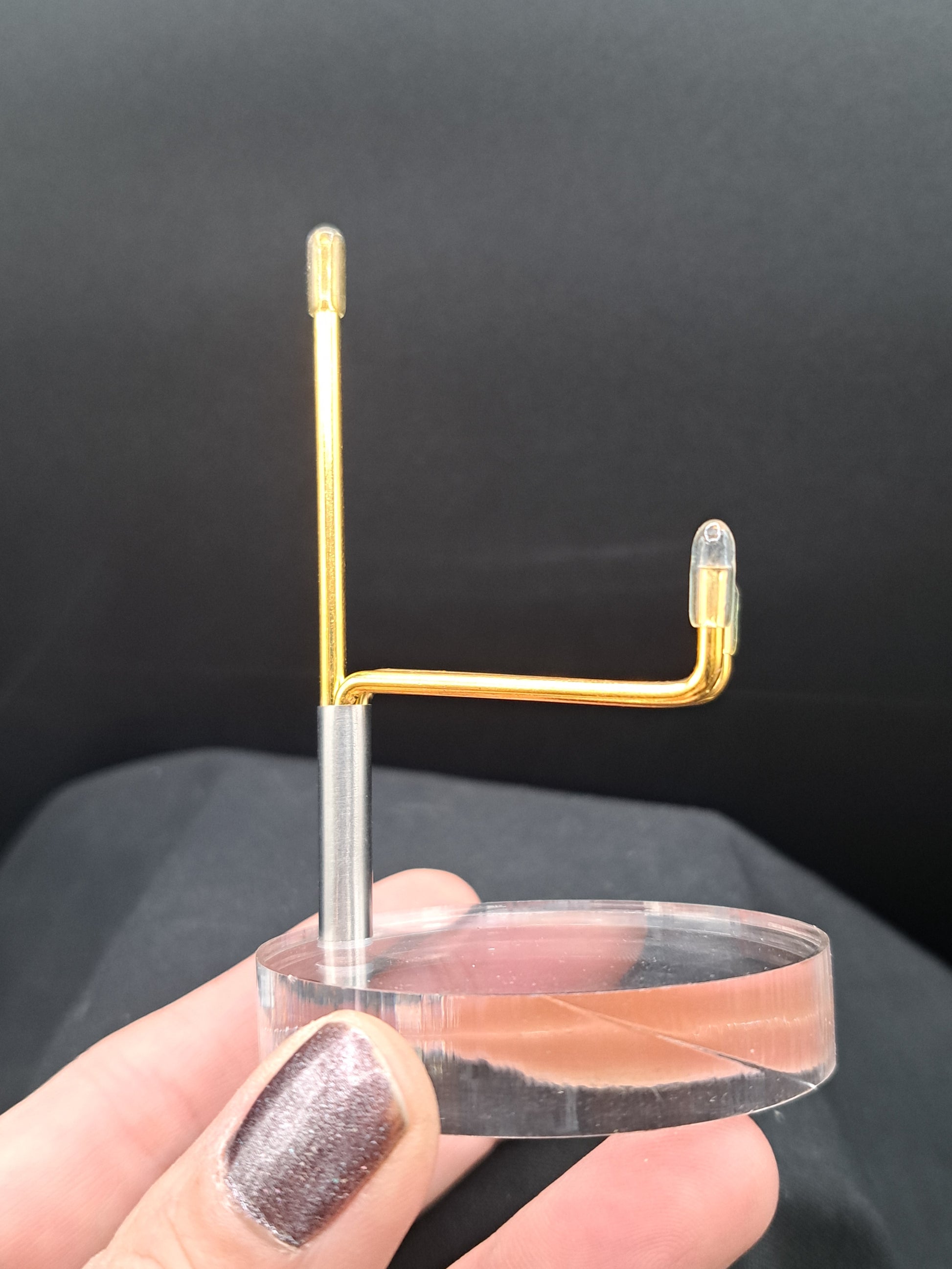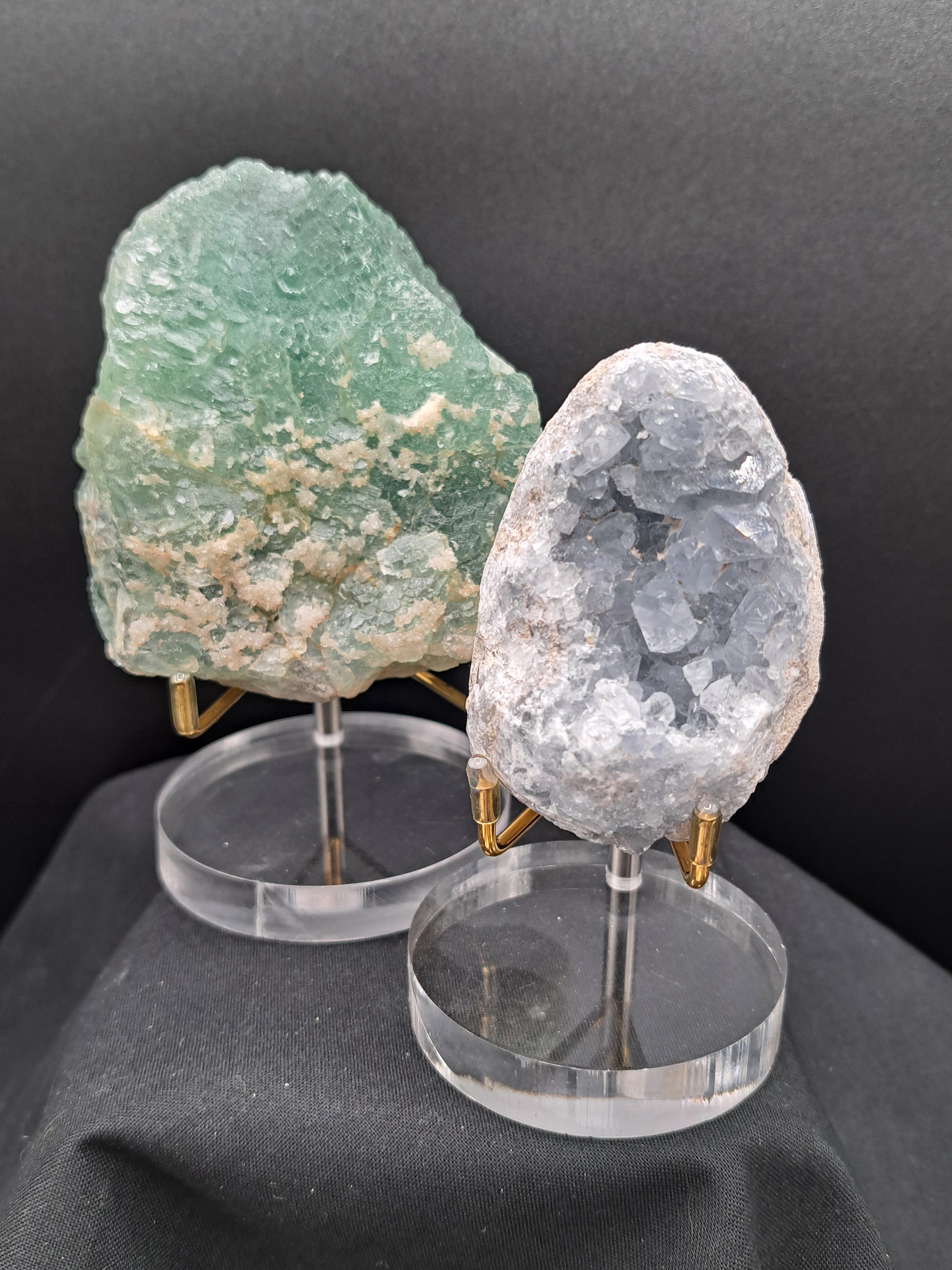 Elevate your collection with an adjustable display stand, pick the size that best fits your specimens! Round acrylic base has gold adjustable arms to fit your crystal. Great addition for irregular shaped specimens. Last photo shows some examples (specimens not included). Small stands 3.75" tall, Large is 4.5" tall.