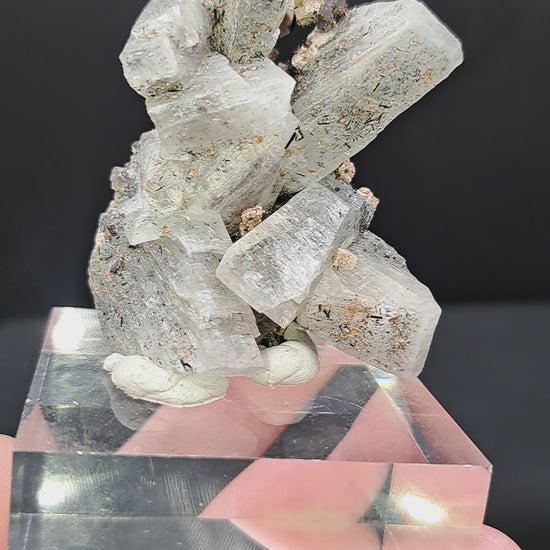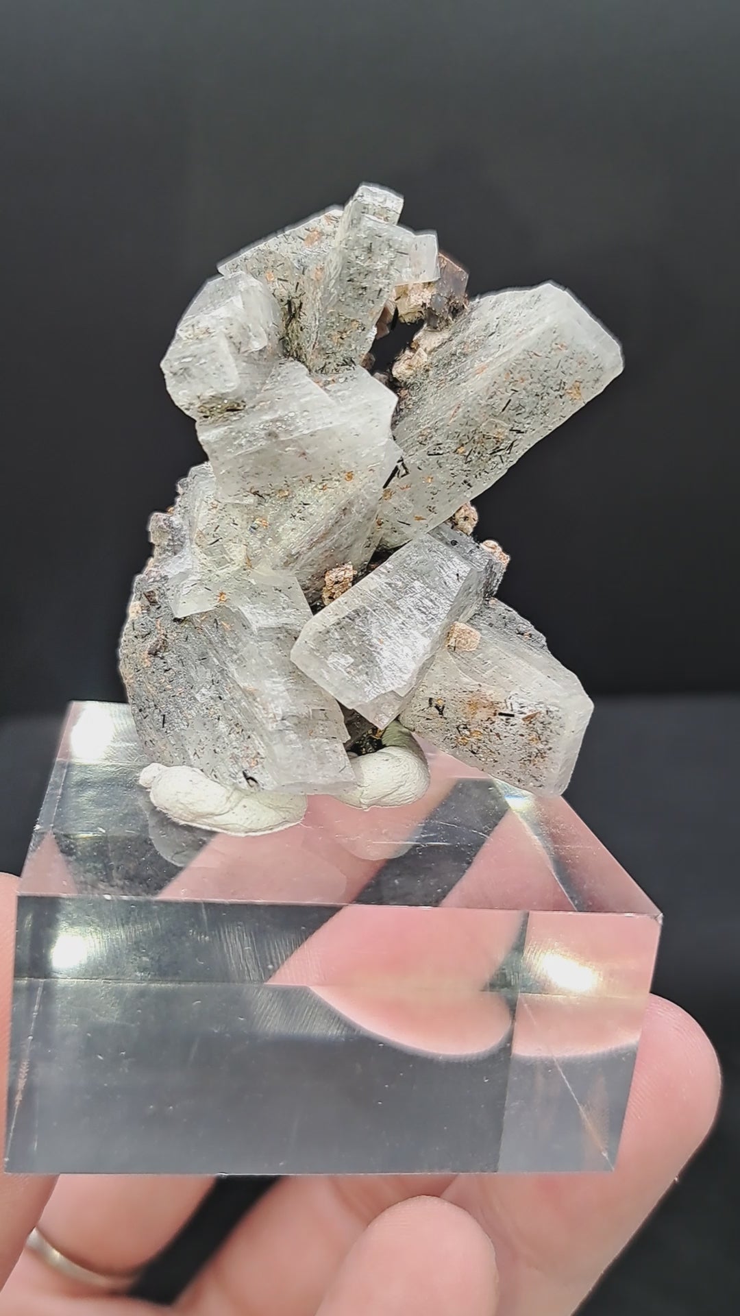 Lustrous crystals of Adularia (variety of orthoclase, think like soft green moonstone) have a drusy coating of epidote and siderite. Definitely a “one of a kind” piece! Mounted on a 2” acrylic stand for display. Without stand, crystal size is approx. 2.25” tall. From Skardu, Pakistan.