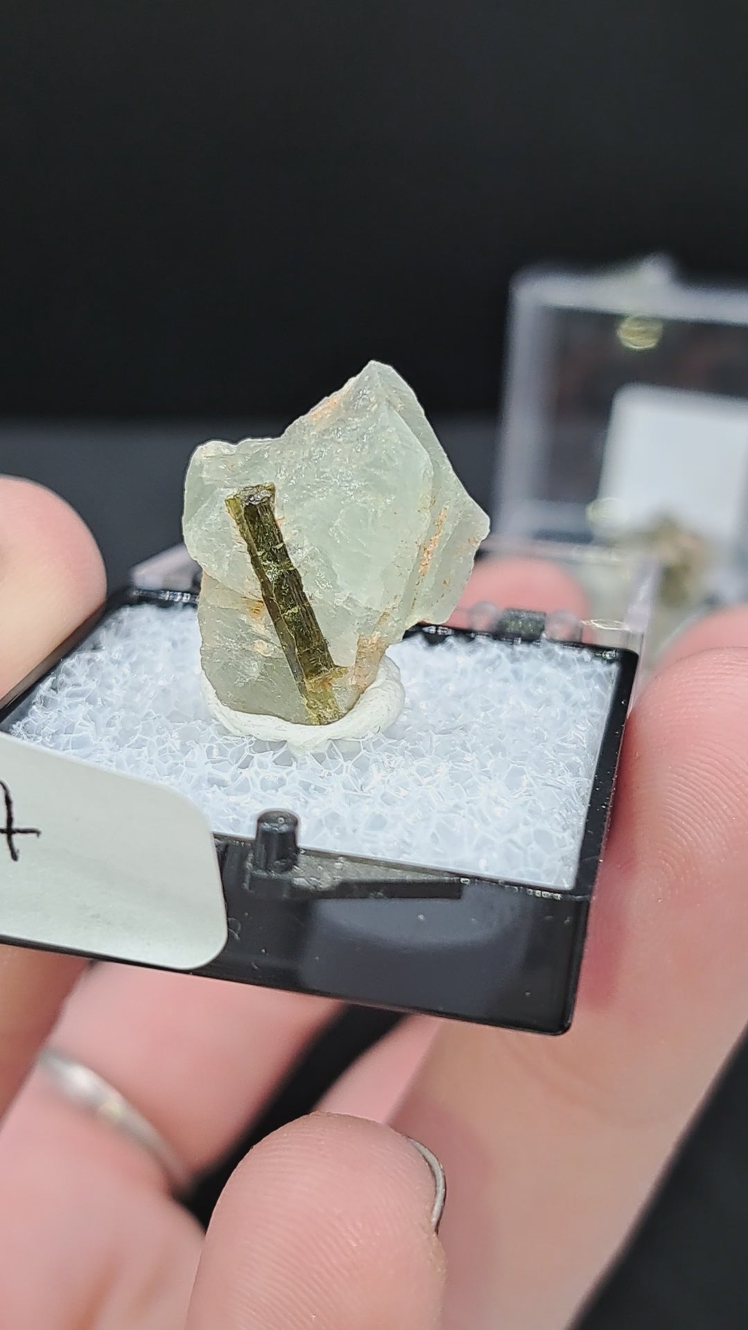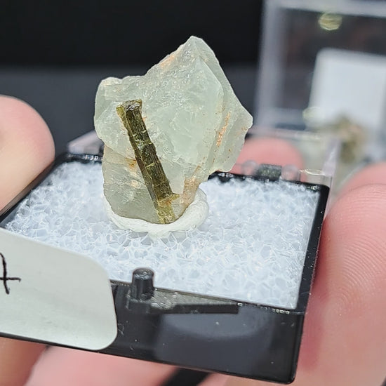 Lustrous crystals of Adularia (variety of orthoclase, think like soft green moonstone) sit nestled with shiny epidote. Adularia has a soft green undertone. Mounted in a 1.25” perky box for display. Crystal size is approx. .75” tall. From Skardu, Pakistan.