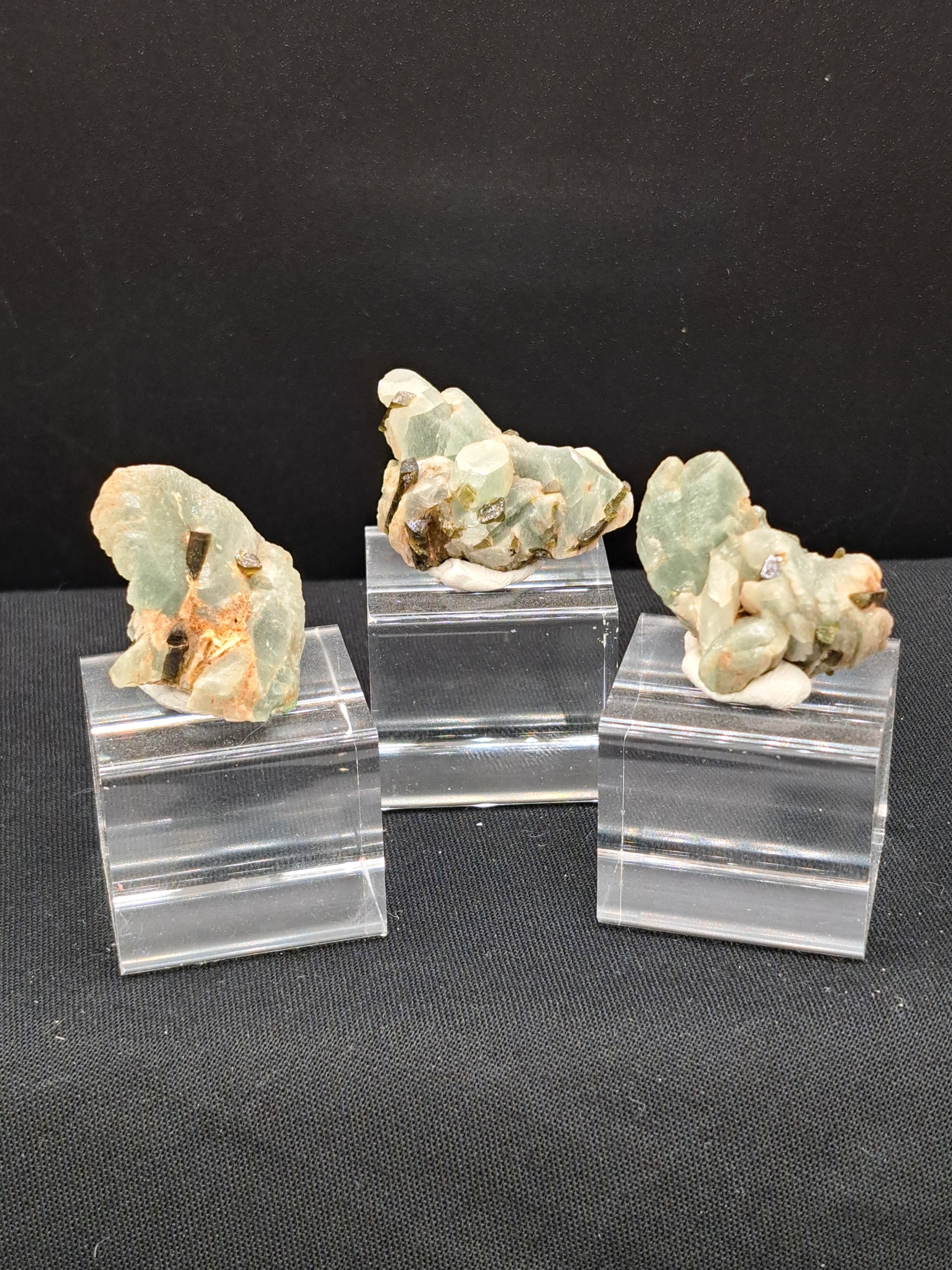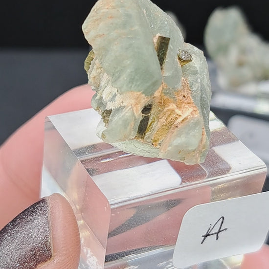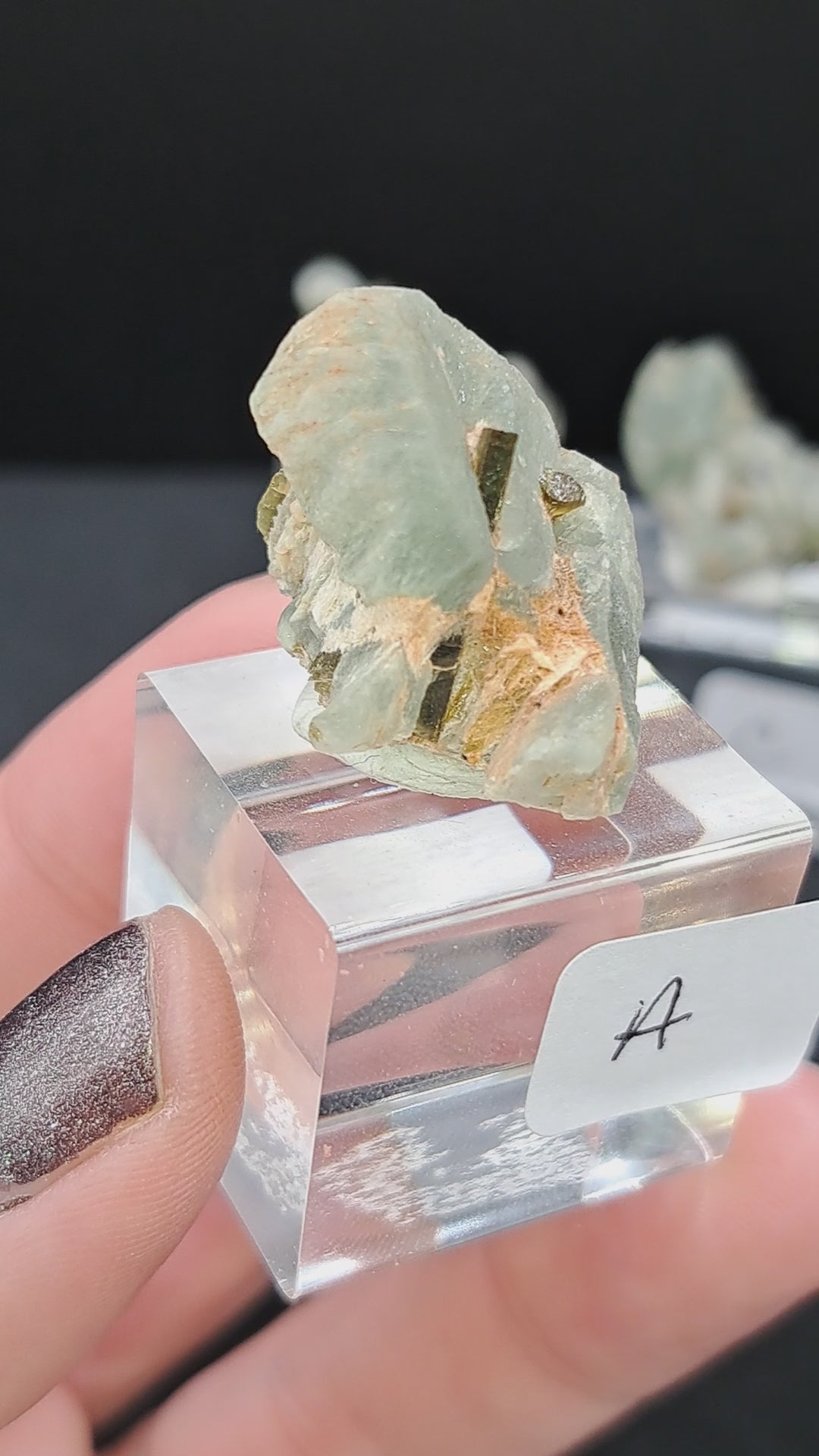 Lustrous crystals of Adularia (variety of orthoclase, think like soft green moonstone) sit nestled with shiny epidote. Adularia has a soft green undertone. Mounted on a 1” acrylic cube. Crystal size is approx. .75” - 1" tall. From Skardu, Pakistan.