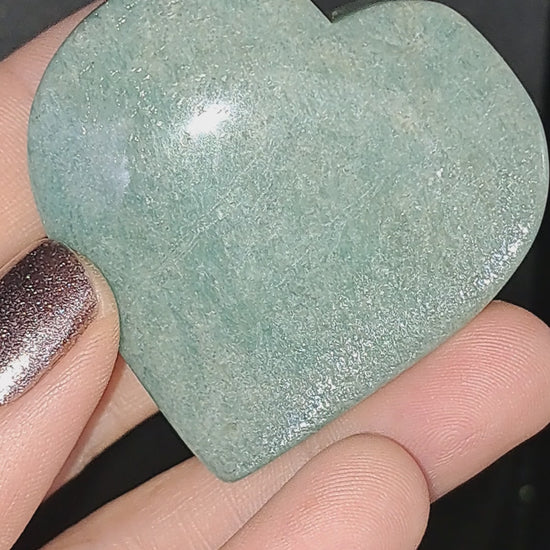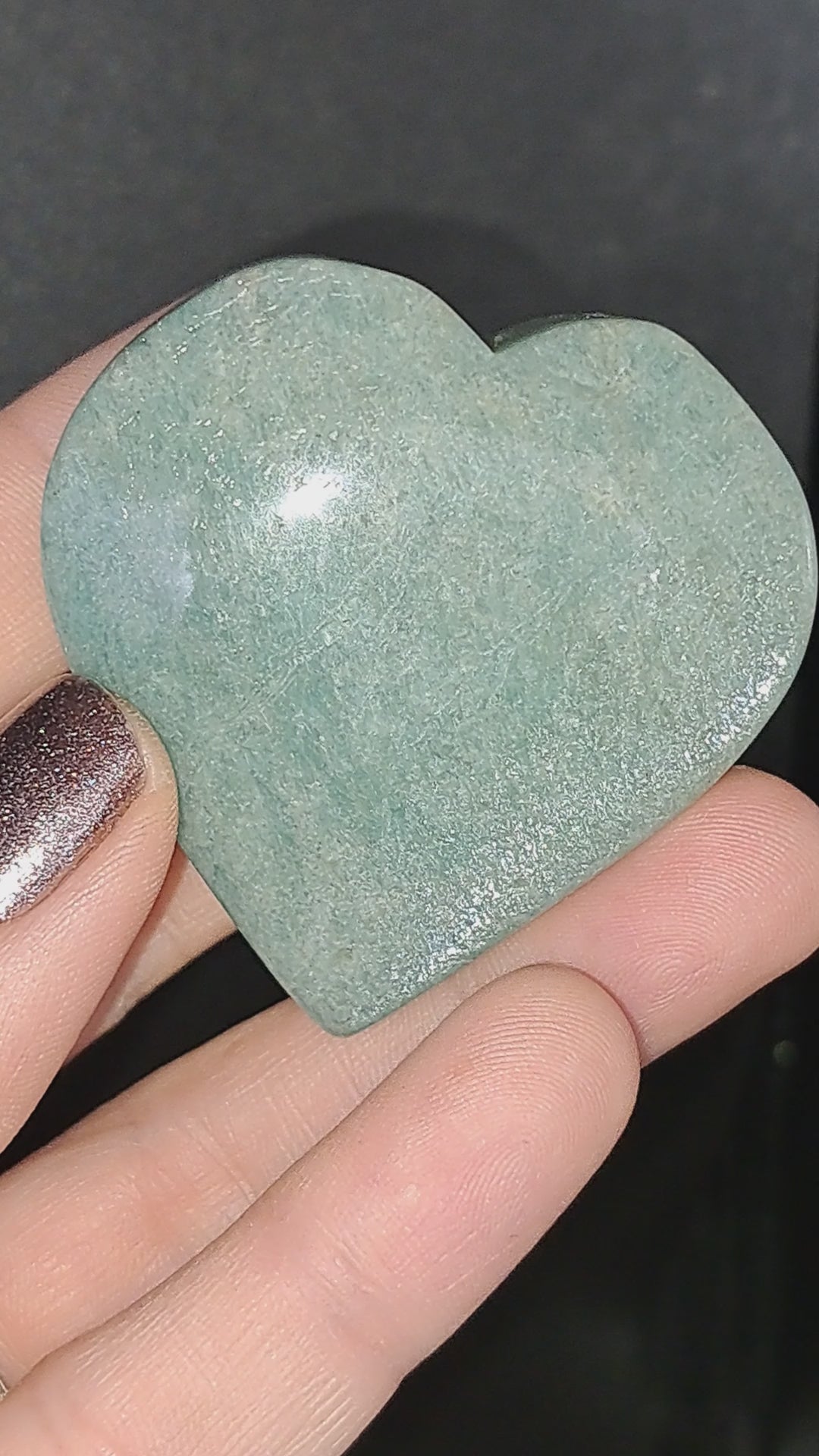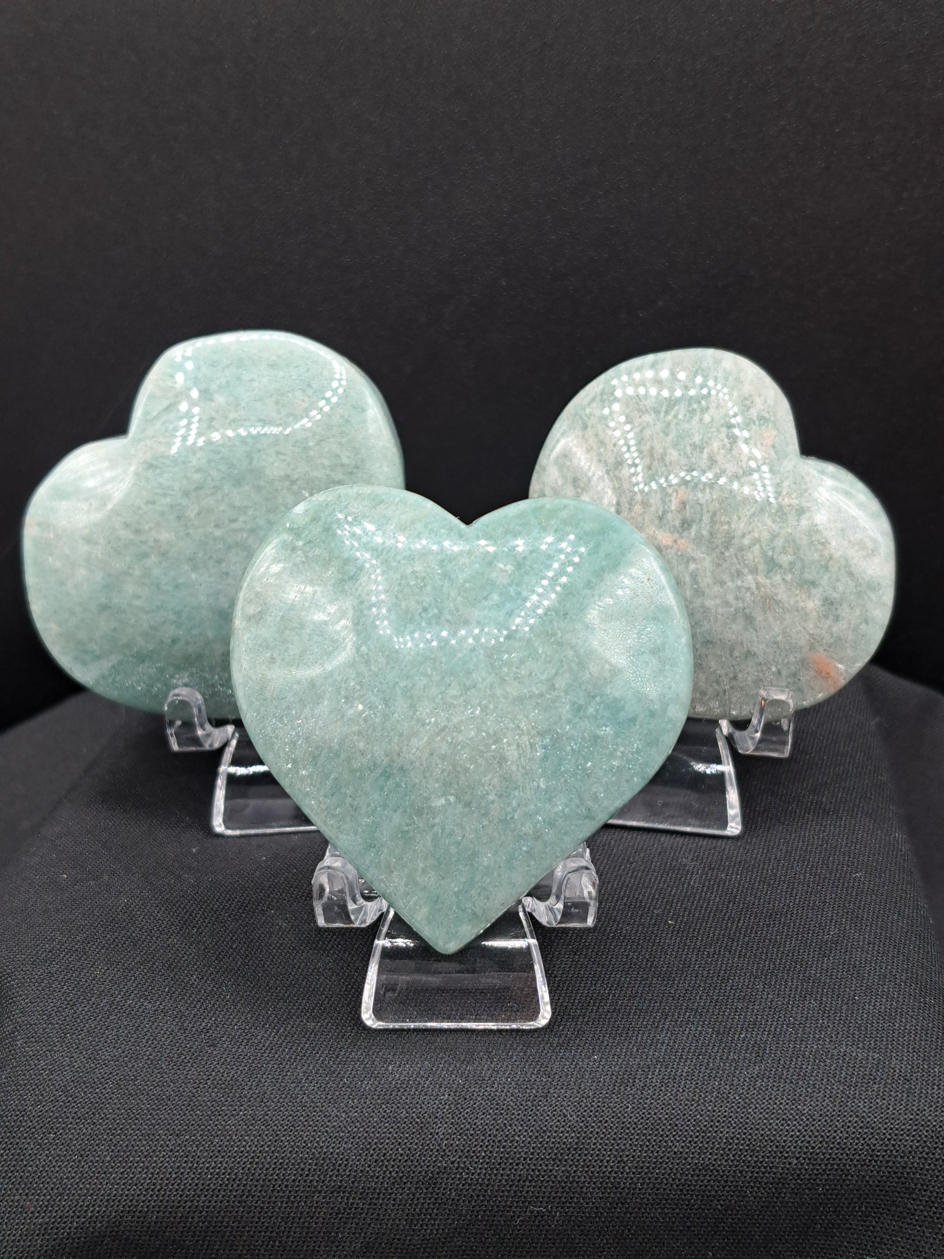 Shimmery mint green amazonite hearts are perfect for your pocket or as a gift! Photo is representative of batch, will be intuitively chosen. Approx. 2" long. From Madagascar. Plastic easel is for photo only, not included.