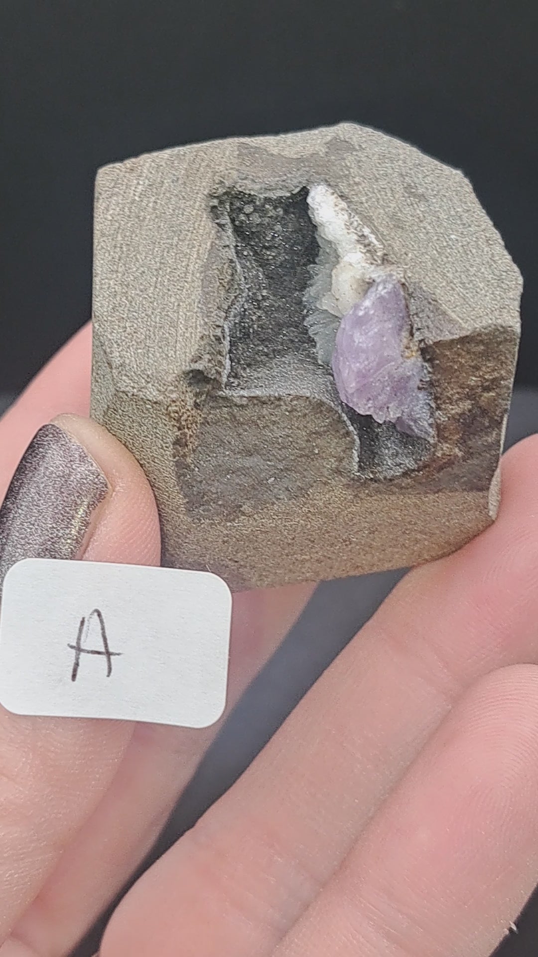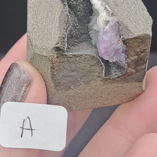 Technically, not a geode but an amygdale, which is a cavity inside volcanic rock. One of the more unique formations for amethyst as these are less common! Beautiful tiny amethyst clusters have accents of quartz, apophyllite, and calcite. A is approx. 1.5" x 1.5", B is 1.25" x 1.75", C is 1.5” x 1.5”, D is 1.5" x 1.5". From Pradesh, India.
