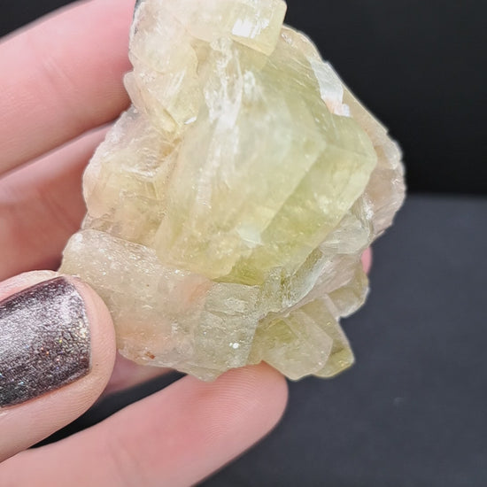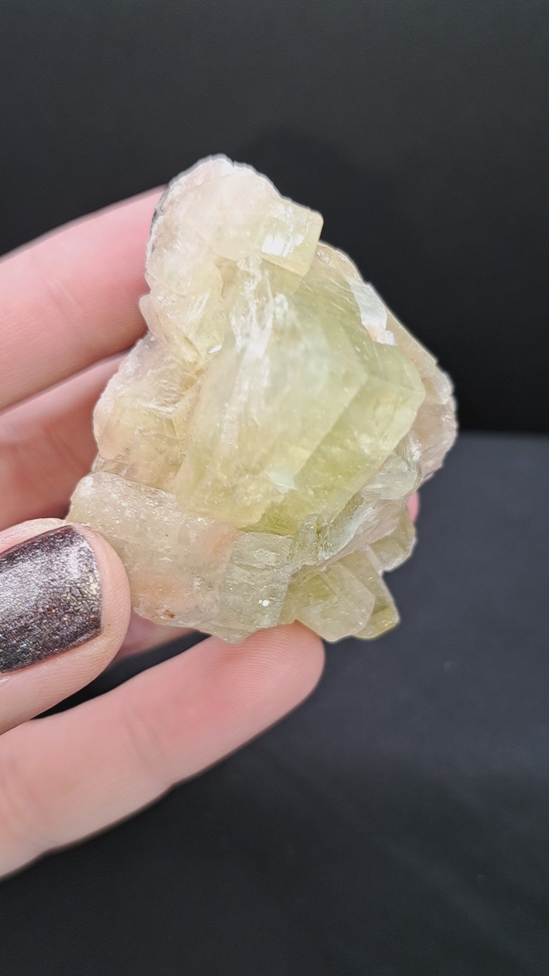 Unique apple green glossy apophyllite is accented with just a touch of peach stilbite. Minimal matrix. Looks great with the small specimen stand (sold separately) or can be displayed flat. Approx. 2.25”. Maharashtra, India.