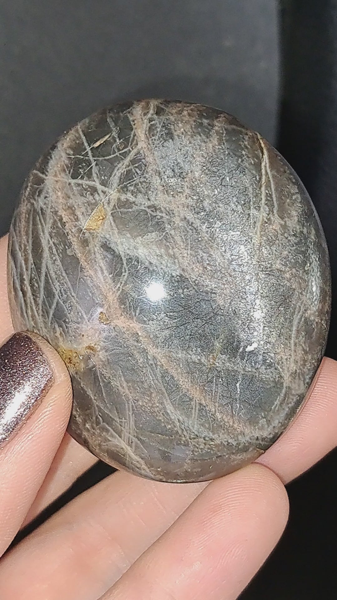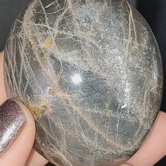 Shimmery black moonstone! Photo is representative of batch, will be intuitively chosen. Choose which size is best for you. From Madagascar. Plastic easel is for photo only, not included.