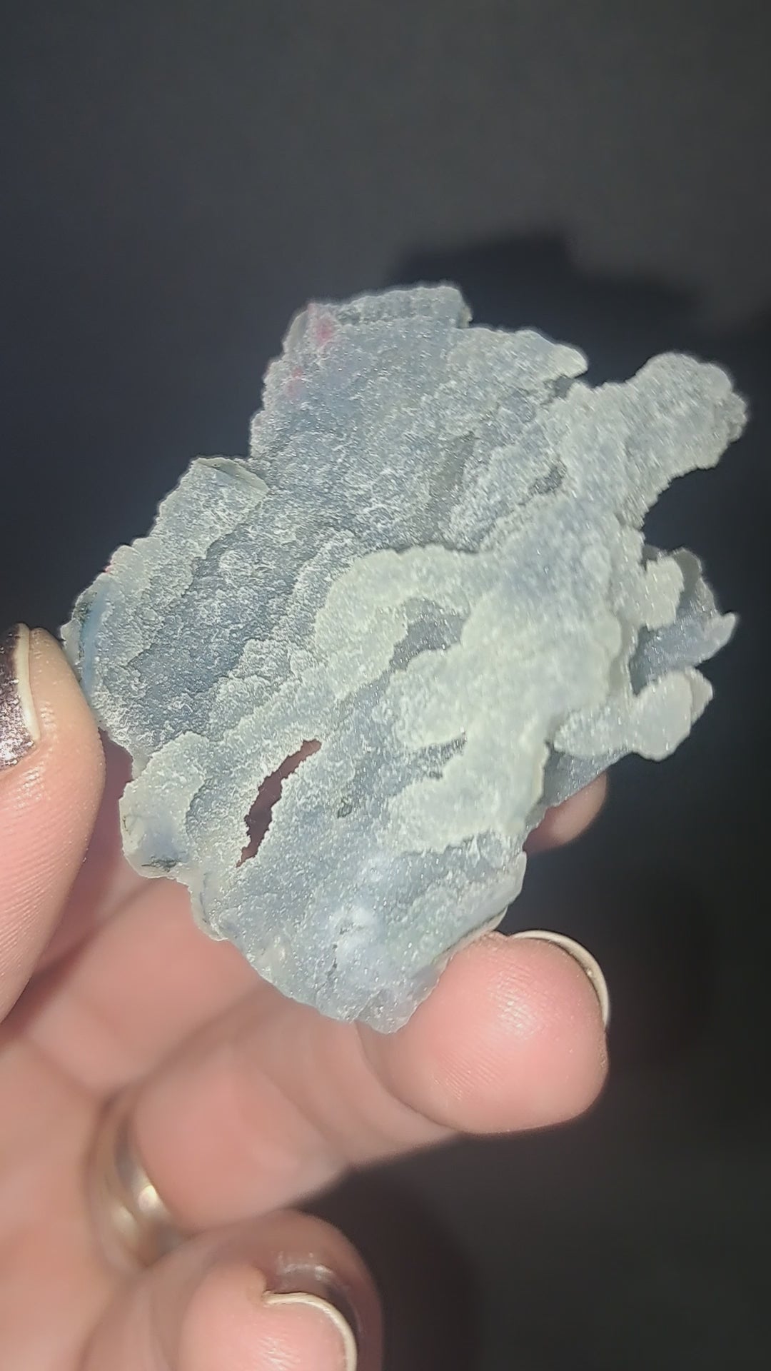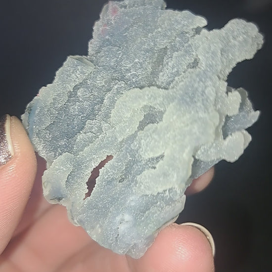 Photo is representative of batch; purchase will be for 1 piece intuitively chosen. Very unique formation of Blue Chalcedony that looks like sea coral. They feature a soft, shimmery glitter. Pieces are approx. 2" to 3". From Jalgaon, Maharashtra, India.