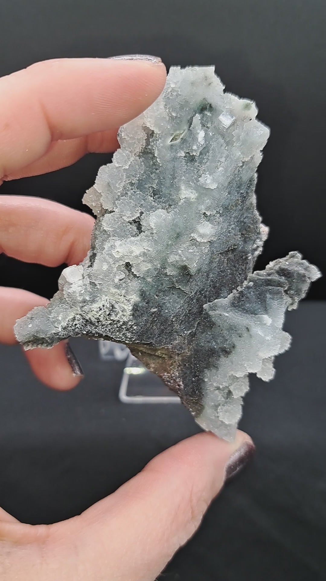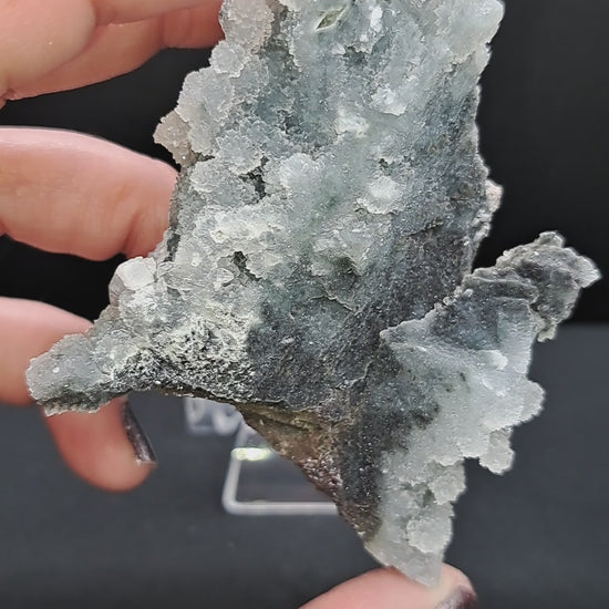 Deep blue chalcedony scattered with drusy baby apophyllite and heulandite crystals. Looks great with included easel stand! I think it looks like a wave. Approx 3.5” x 2.25”. From Maharashtra, India.