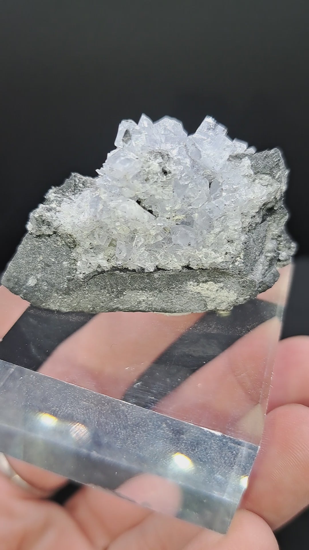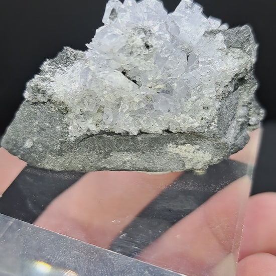 These are phenomenal! Icy clear blue fully terminated crystals cover a dark matrix for a great contrast. Mounted on 2” acrylic block, specimen approx. 1.5” tall. From the Peña Blanca Mine, Boyacá Dept, Columbia.