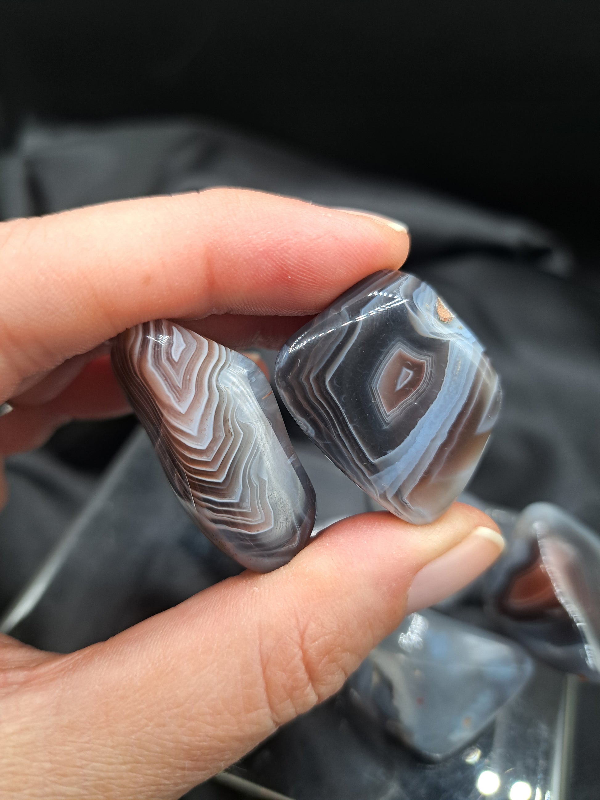 Gorgeous swirls and banding in blues, pinks, grey and white. Price is for individual tumble, photo is representative of batch. Size approx. 1"-1.5". Tumbled by Rachel. From Botswana.