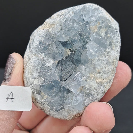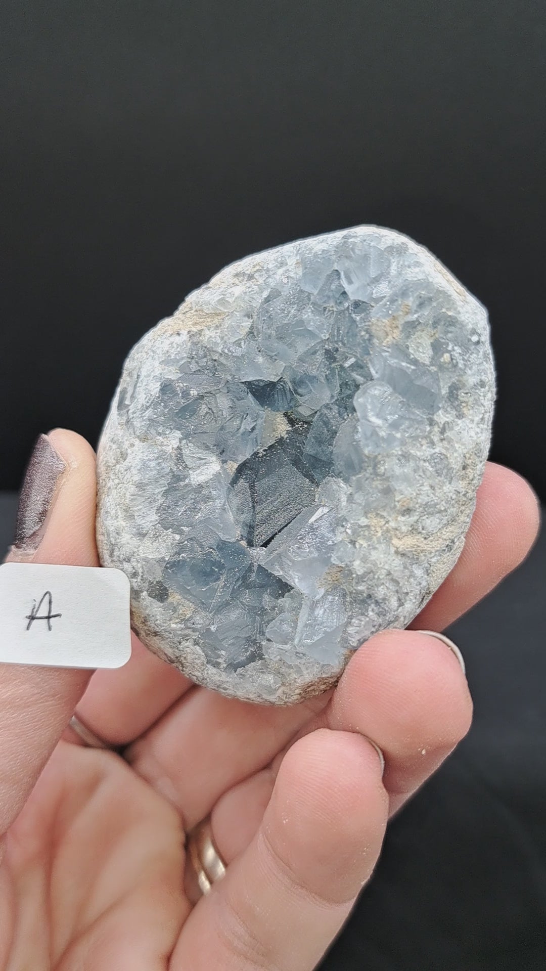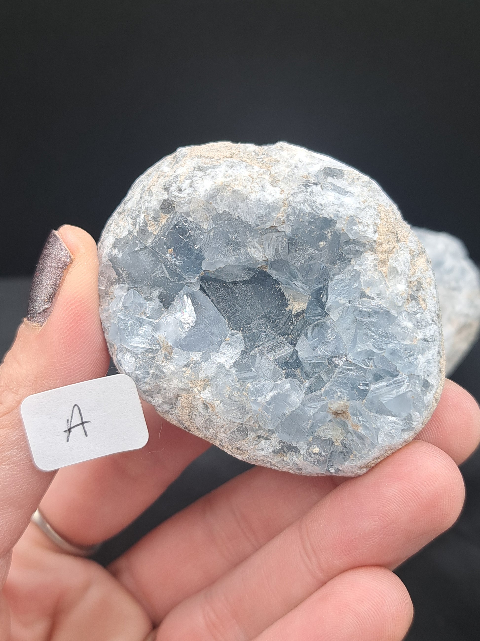 Beautiful gemmy sky blue celestite clusters, choose your favorite! Celestite is also know as Celestine, and can be colorless (with no impurities) or varying shades of sky blue. Each is approx. 2.5". Comes from Madagascar.