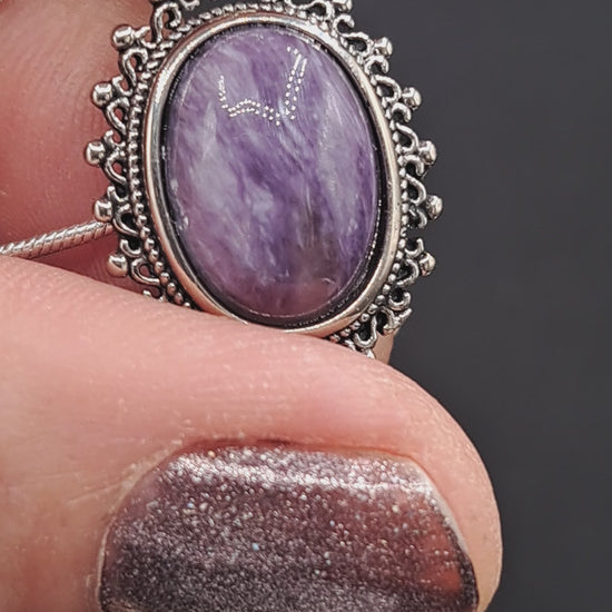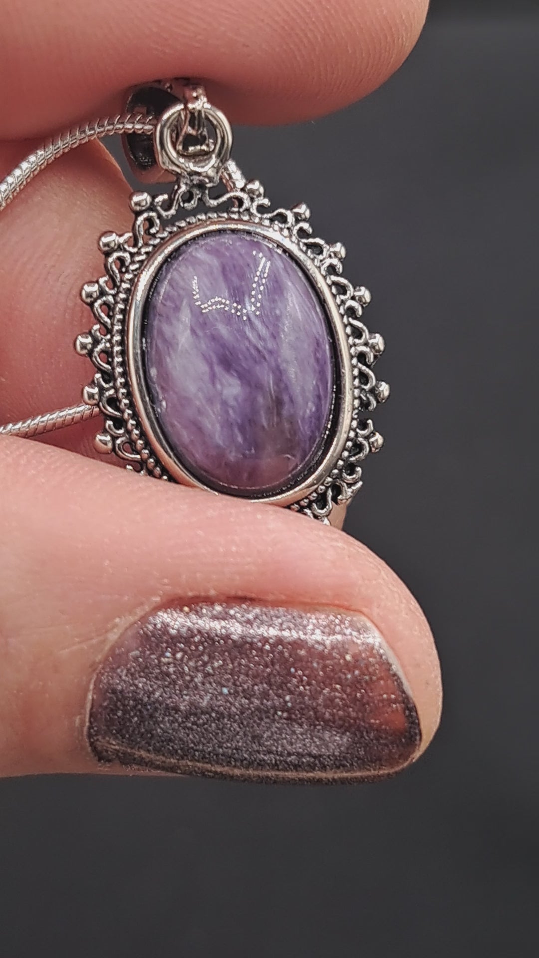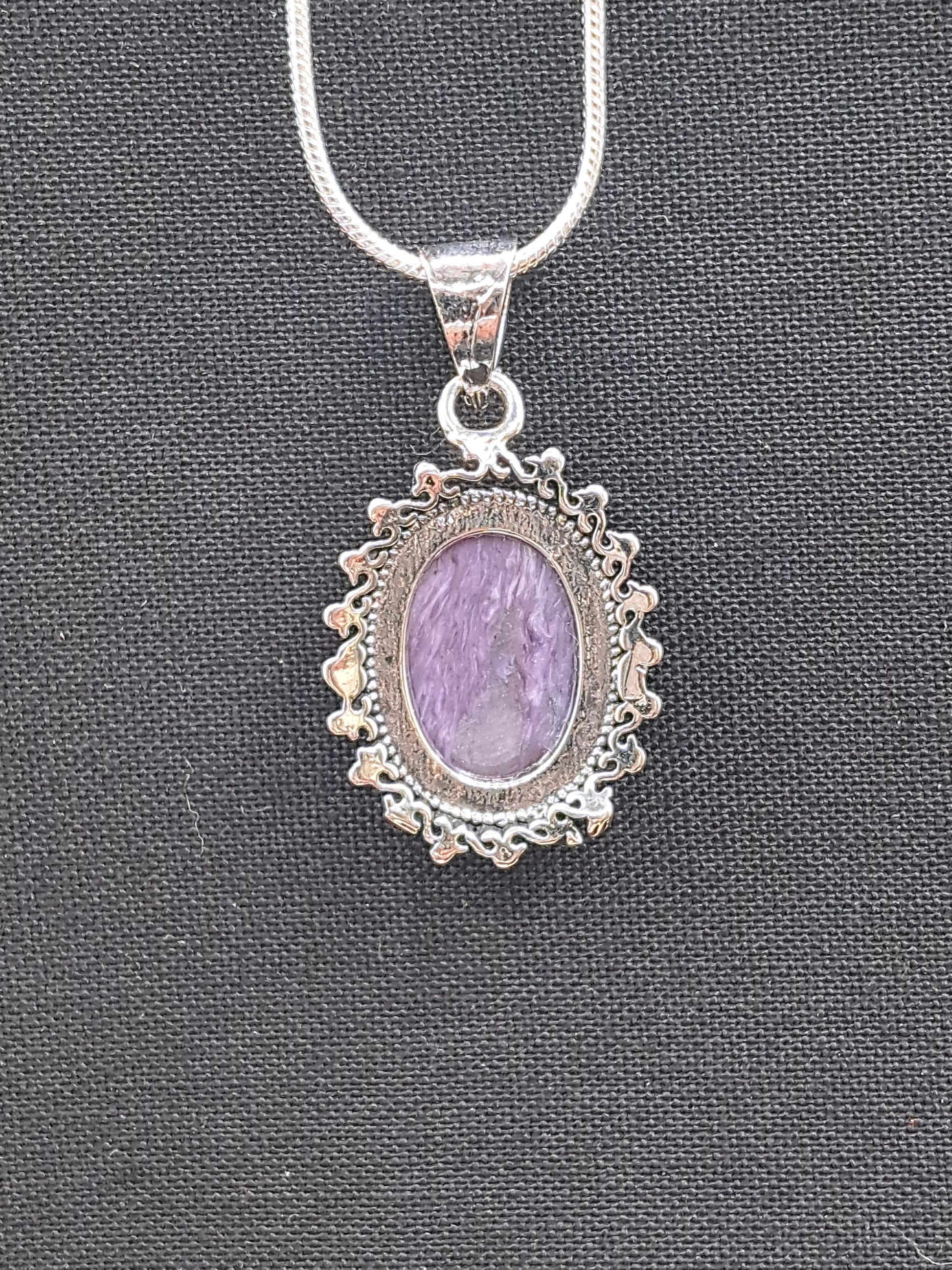 Domed oval shape pendant of swirled Charoite. Natural variation in stones may exist. Comes with 18" silver plated chain. Approximate length of pendant is 1".