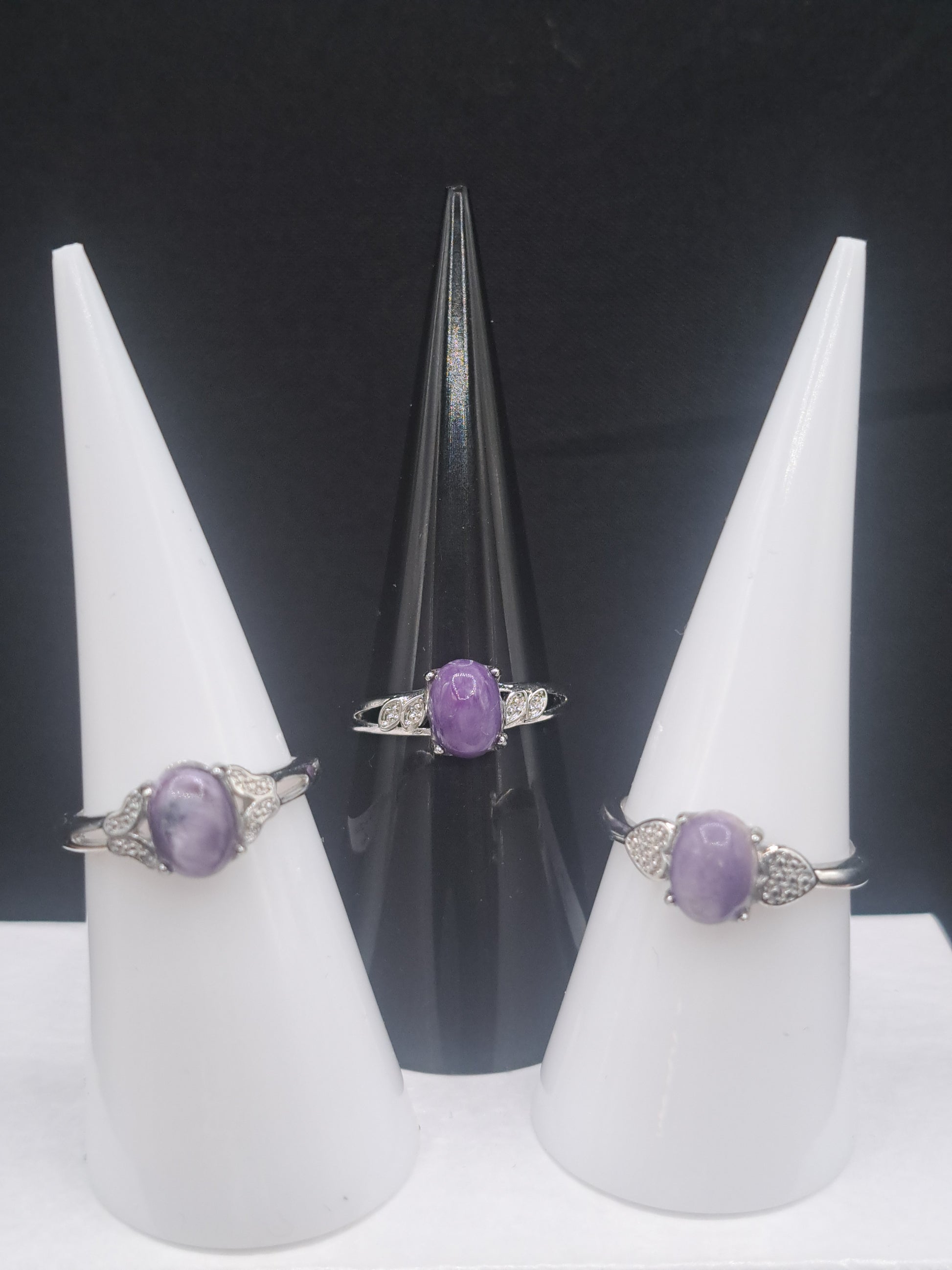 Soft purple domed charoite is set in a white brass band (very tarnish resistant). Style varies with size.