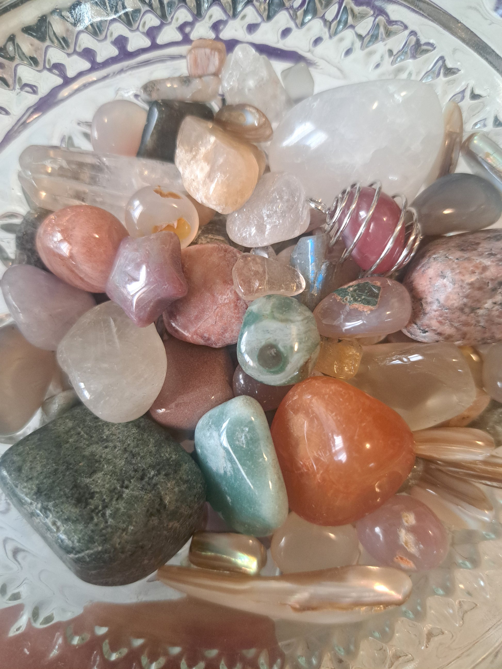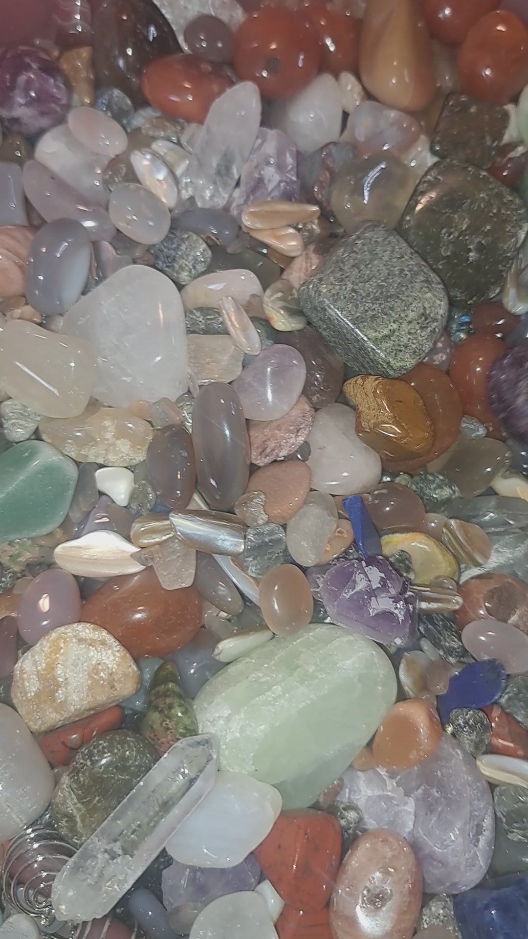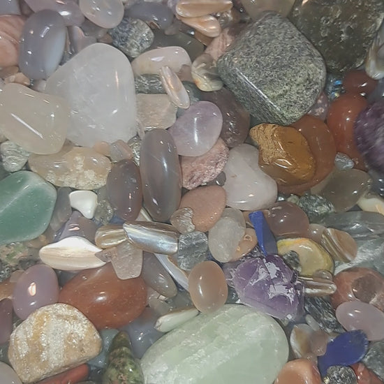 This is a fun little mix that includes chips of black moonstone, golden rutile quartz, abalone shells, and labradorite. It also includes a variety of tumbles including, but not limited to: carnelian, snowflake obsidian, fire quartz, sodalite, Mozambique confetti sunstone, Madagascar Lepidolite, Indian Agate Cubes, mini amethyst clusters, clear quartz points, necklace cages and much more! Pictures show example scoops, will come packaged in a nylon mesh bag. Each scoop varies, no material can be guaranteed. 2/3 cup measurement is approx.