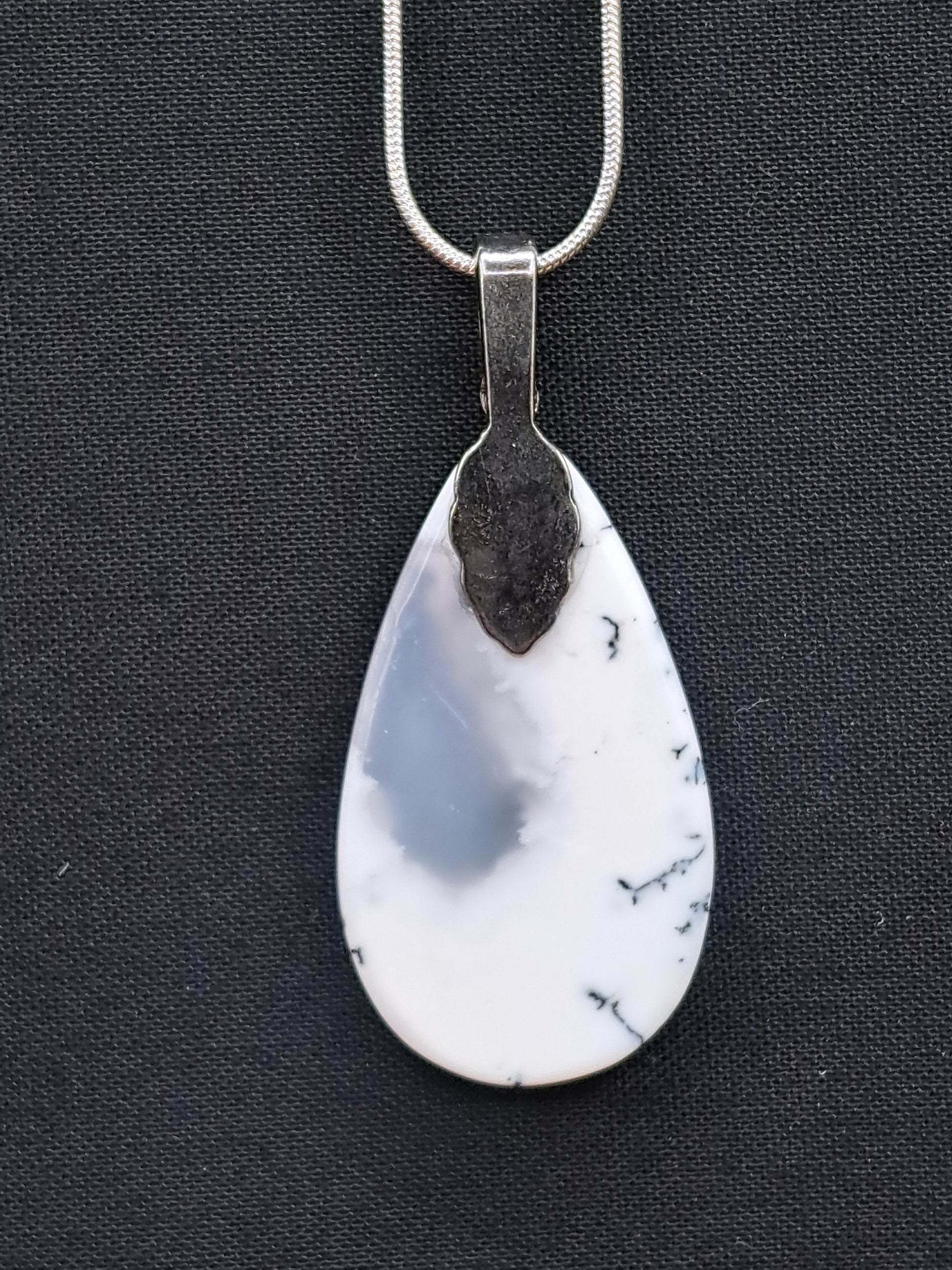 Pendant has beautiful contrast with dark dendrites in white and clear agate. Cabochon attached to matching bail with reliable E6000 adhesive by Rachel. Comes with 18" Silver plated chain. Approximate length of pendant is 2".