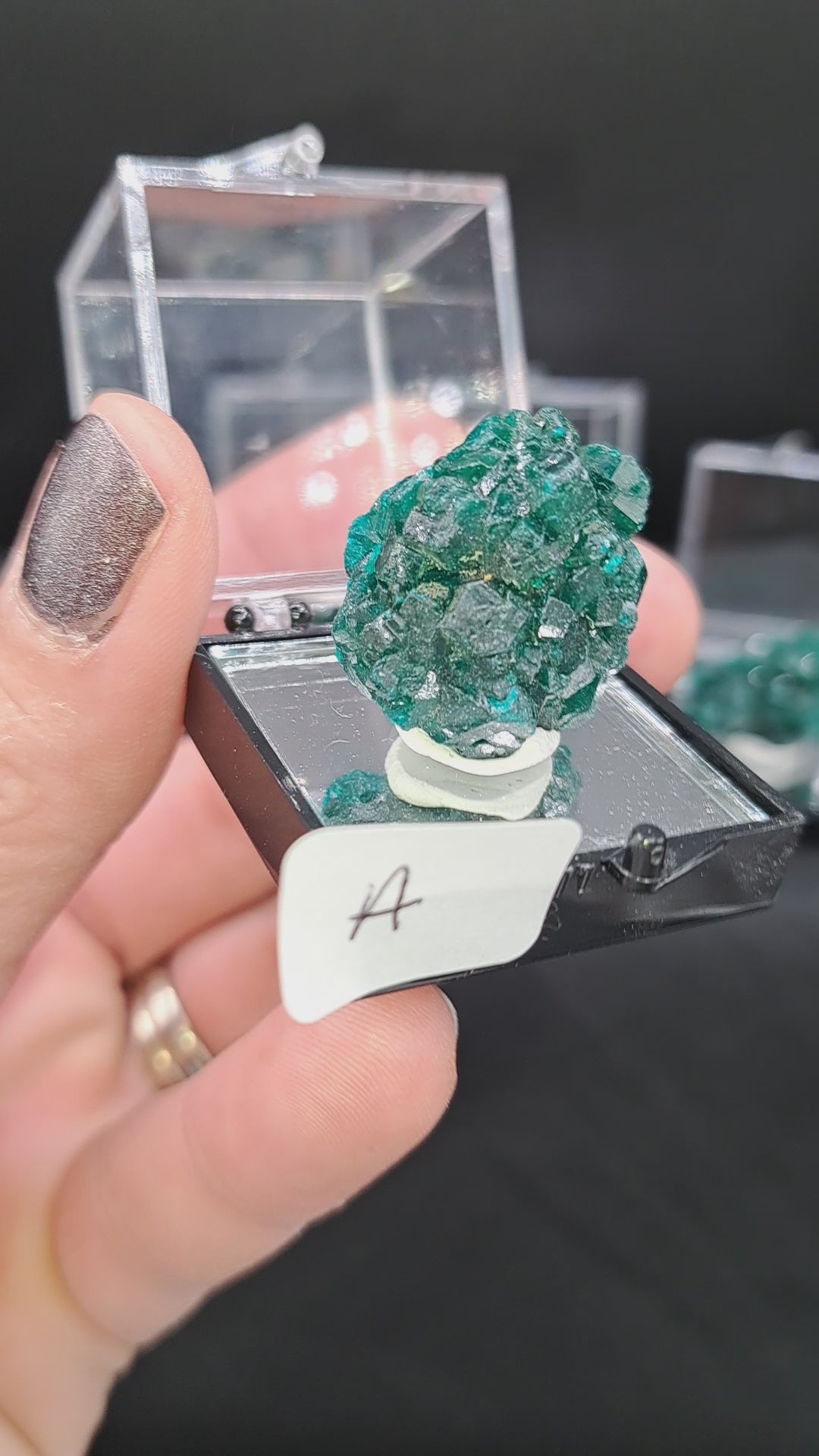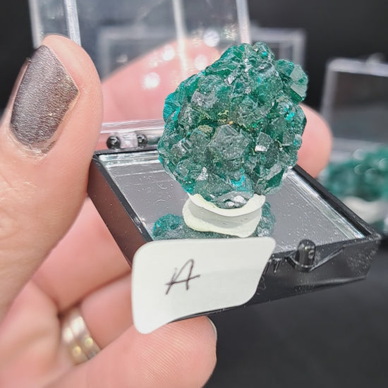 Rich deep gemmy green dioptase in a standard 1.25" perky box with mirror insert. Specimens are approx. 1” tall. From Democratic Republic of the Congo.