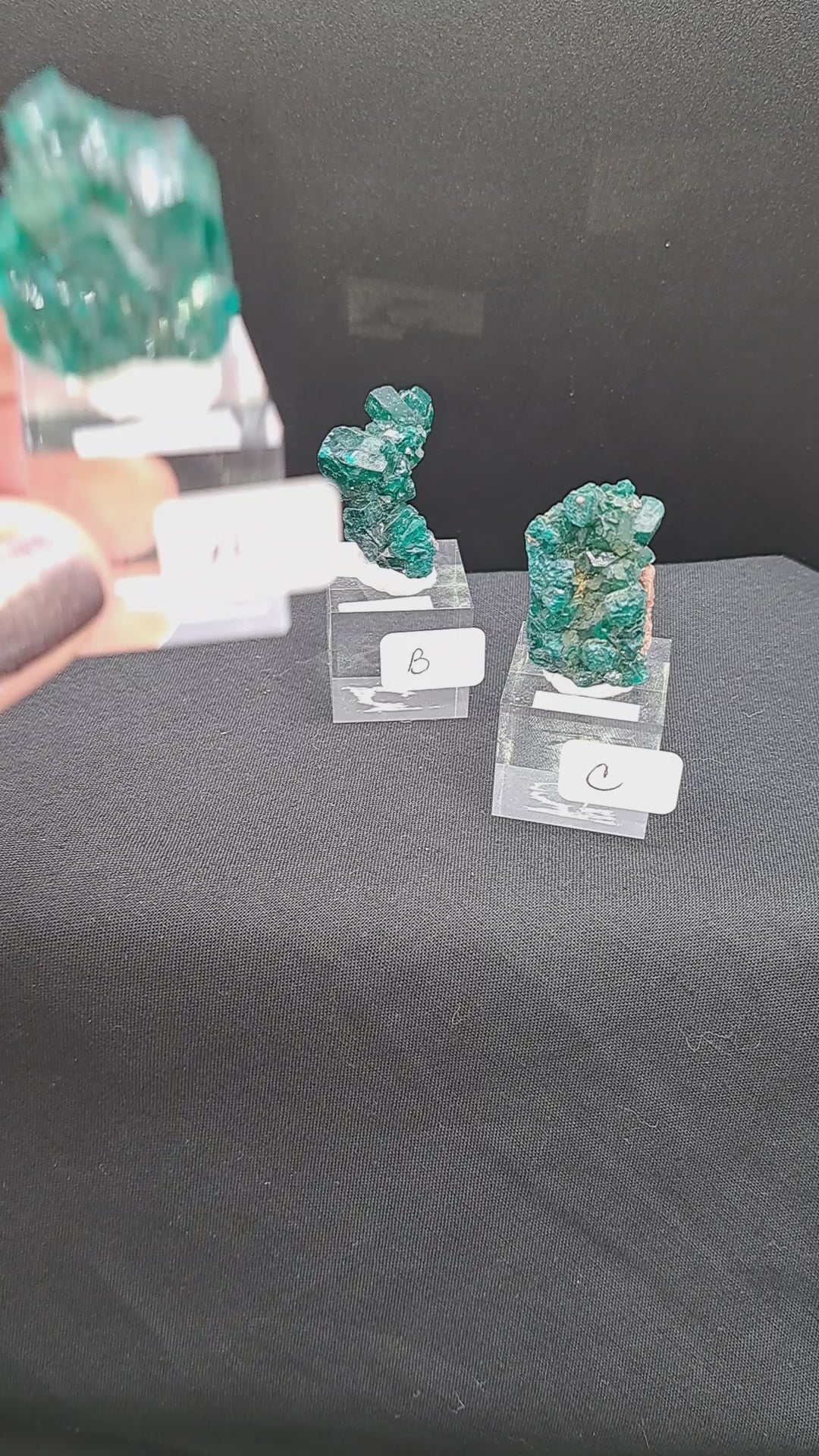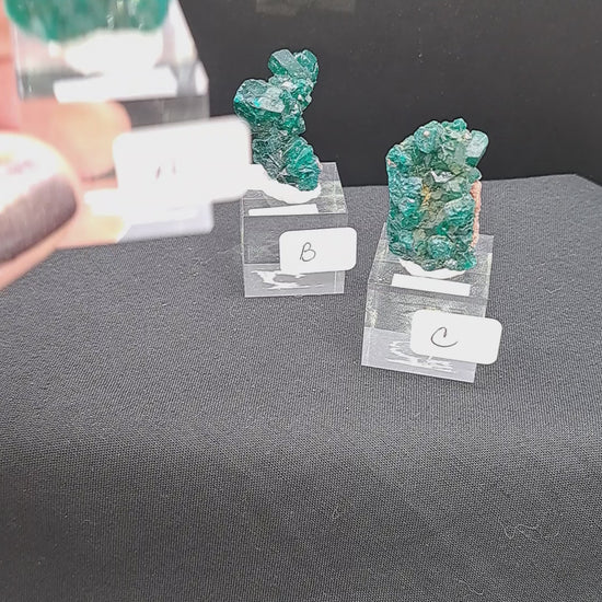 Rich deep gemmy green dioptase on a 1” acrylic cube. Specimens are approx. 1” tall. From Democratic Republic of the Congo.