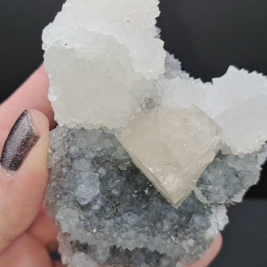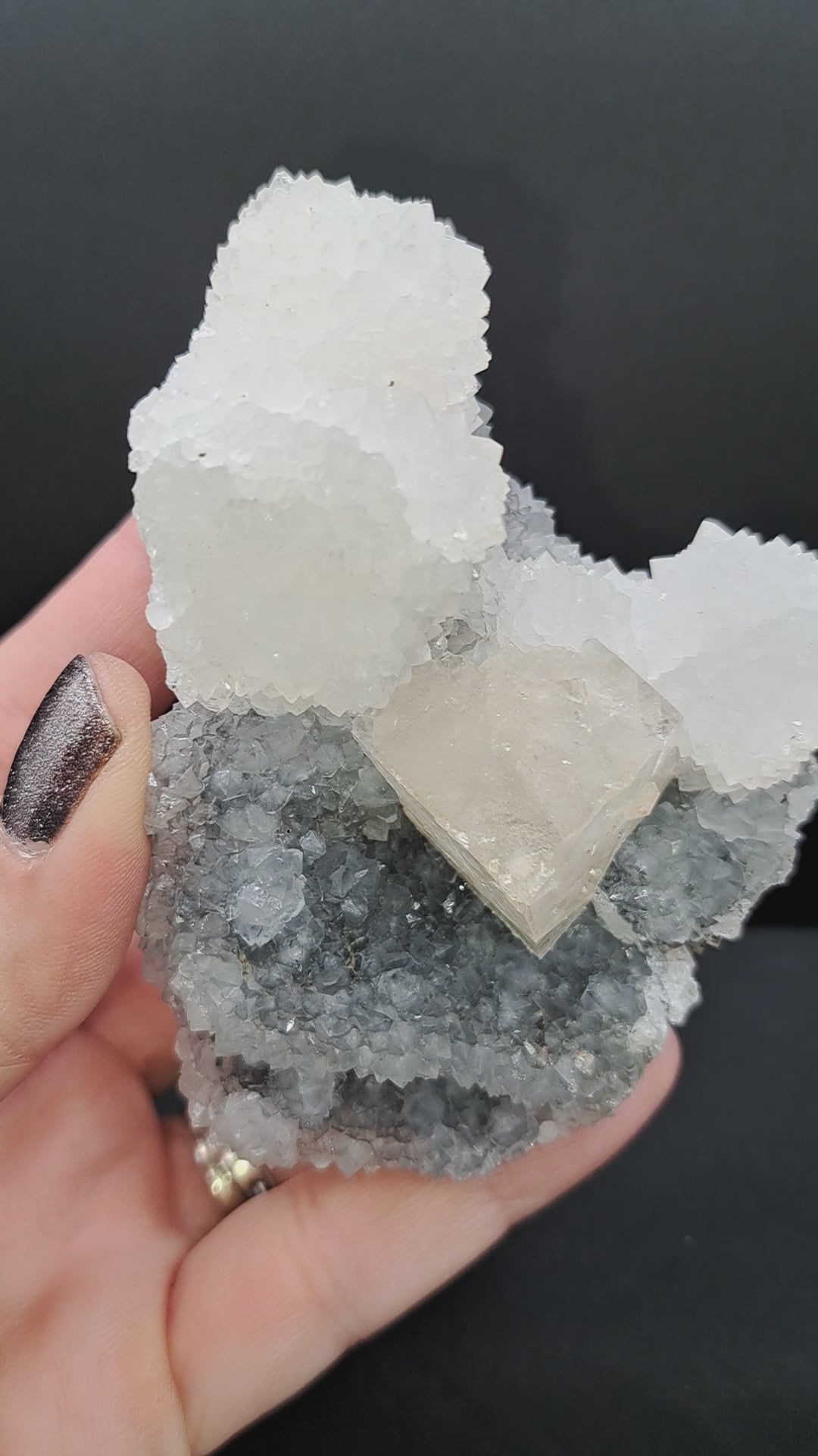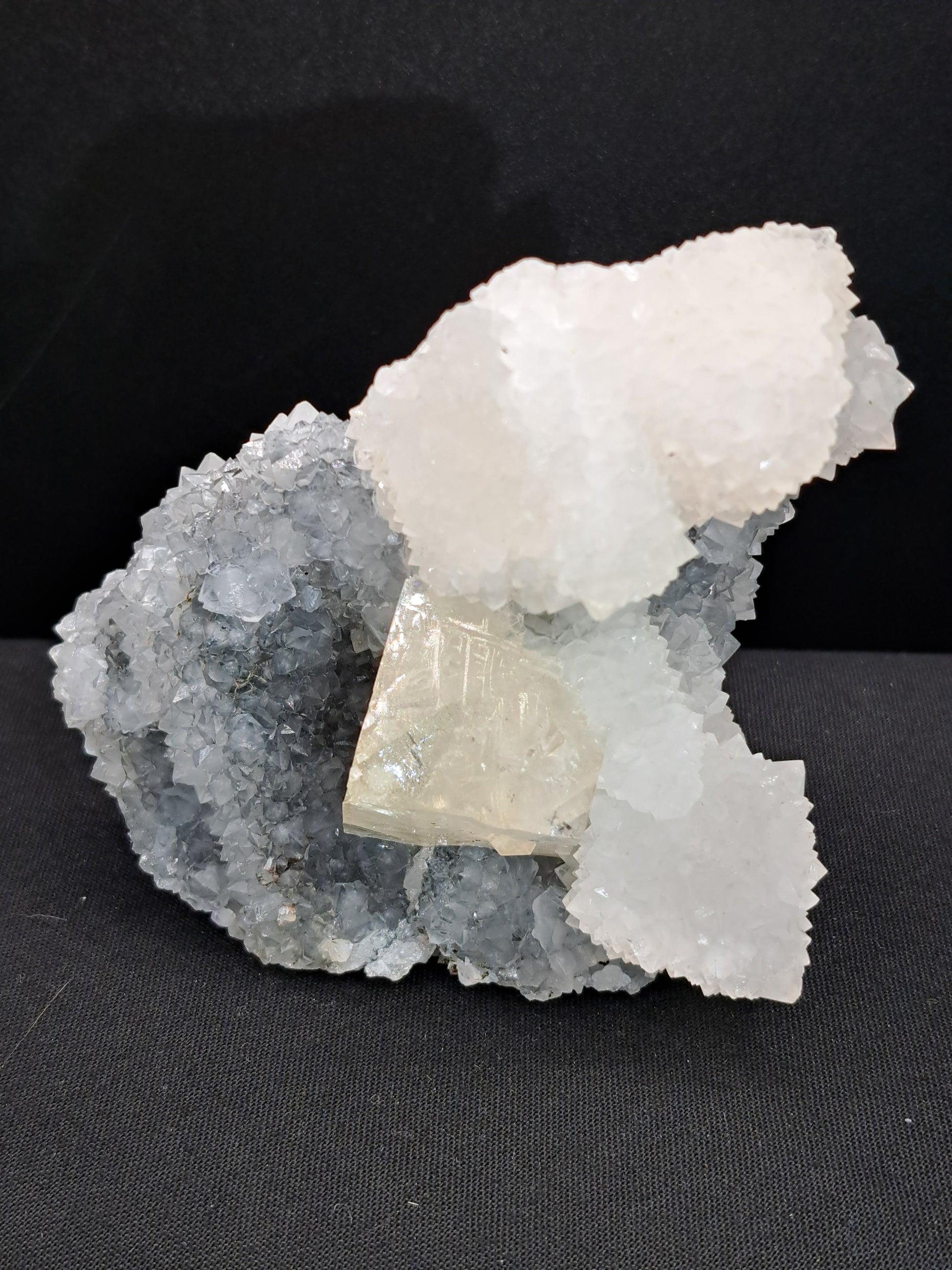 Golden calcite cube surrounded by baby apophyllite drusy. Has additional calcite on back. Looks great on a mineral display or can self-stand. (Shown with small stand, sold separately). Approx 3” tall, self-standing. From Maharashtra, India.