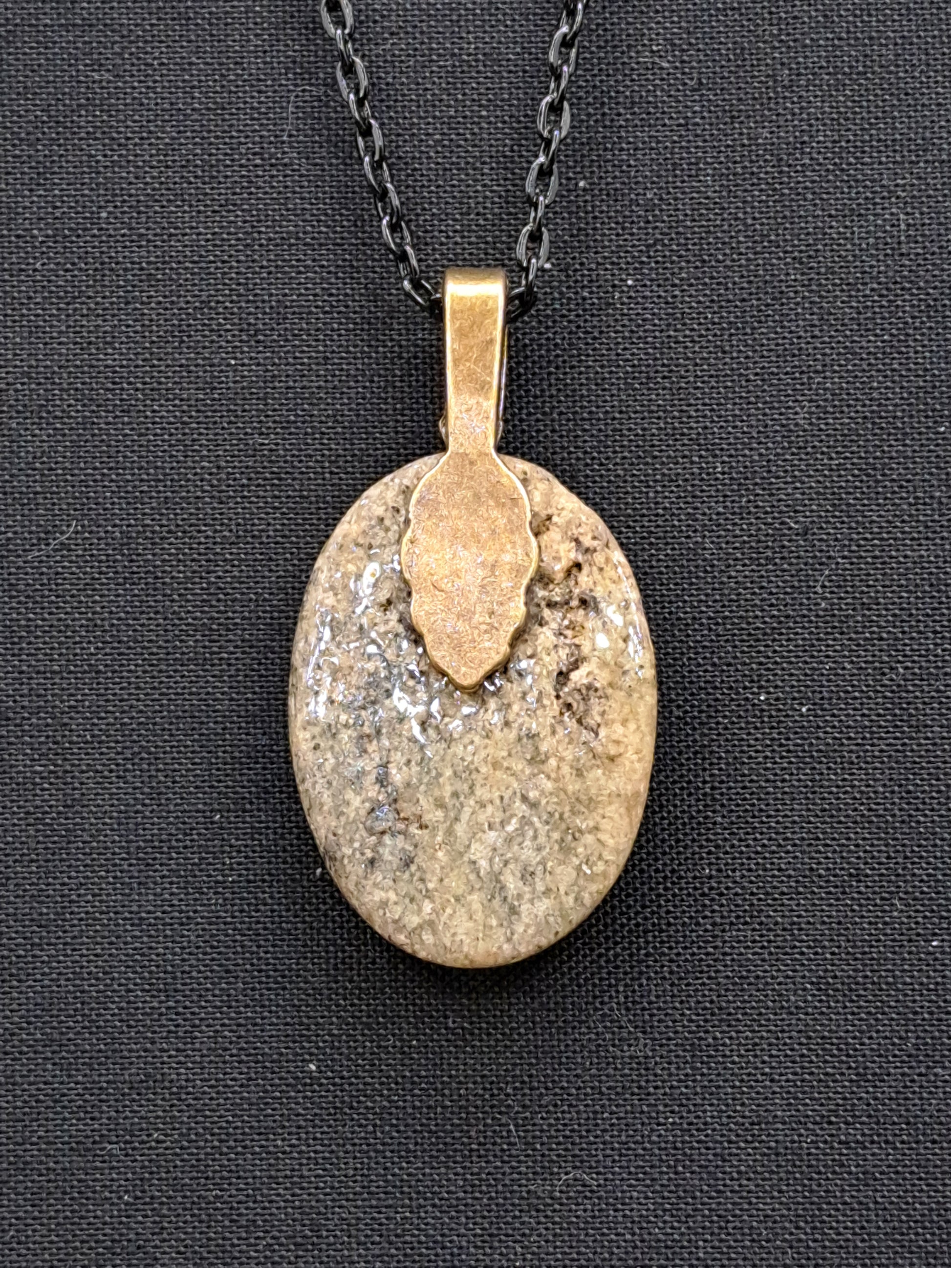 Mica in quartz gives off subtle shimmer and sparkle. Cabochon attached to matching bail with reliable E6000 adhesive by Rachel. Comes with 18" black colored chain. Approximate length of pendant is 1.5".
