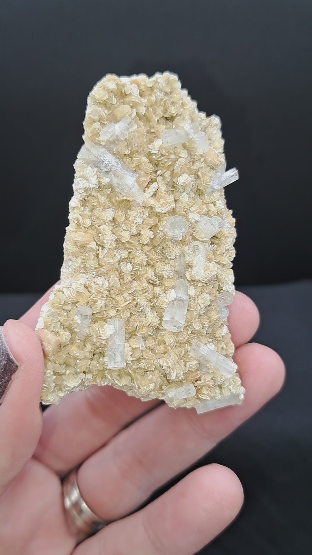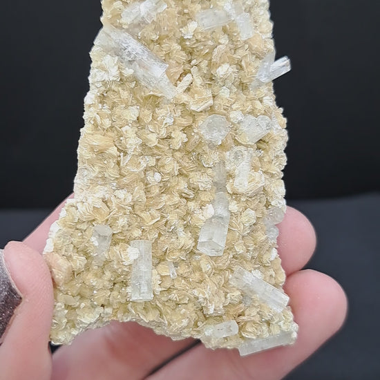 Goshenite is a colorless variation of beryl (blue would be aquamarine). Beautiful cluster full of rich and pearly muscovite, scattered with goshenite crystals. Comes with acrylic easel. Size approx. 3” x 2”. From Erongo Region, Namibia.