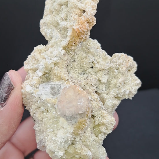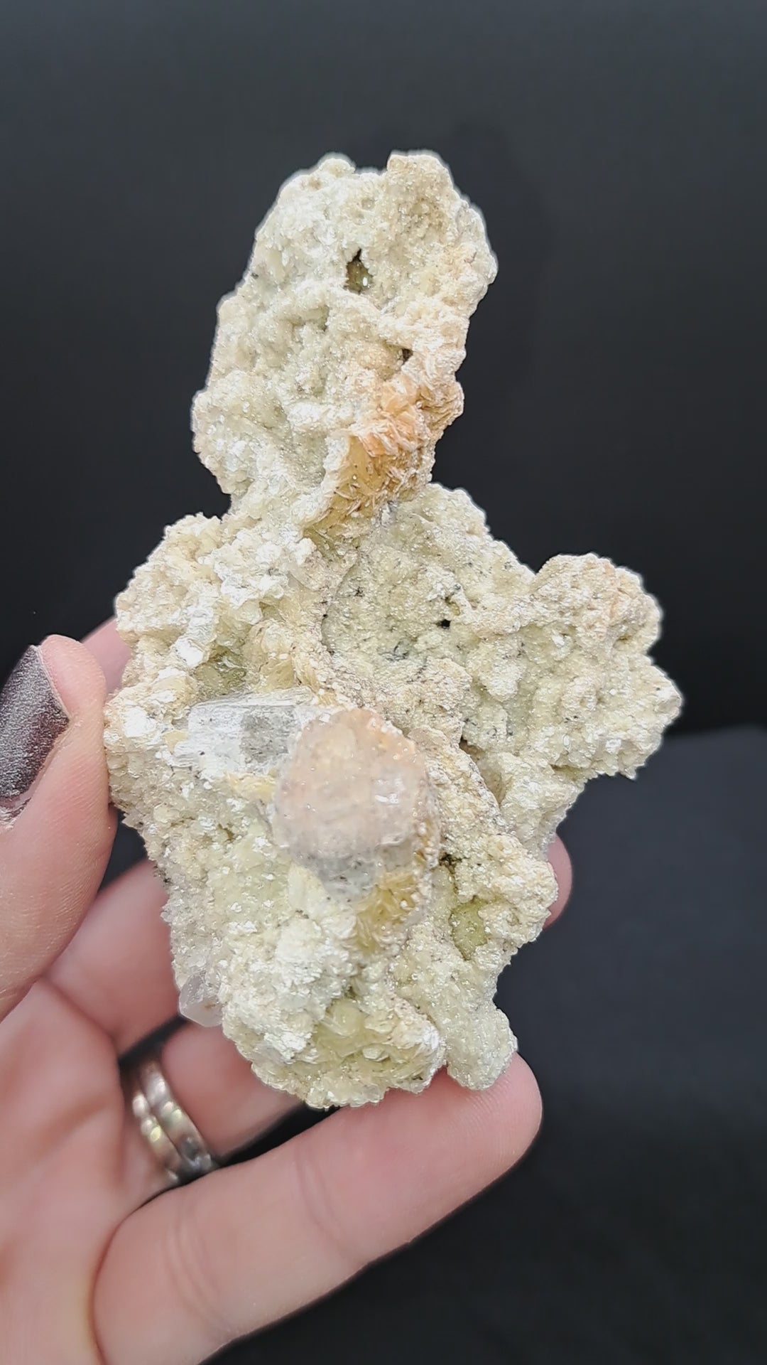 Goshenite is a colorless variation of beryl (blue would be aquamarine). Beautiful cluster full of rich and pearly muscovite, with 2 goshenite crystals displayed front and center. Comes with acrylic easel. Size approx. 3.75” x 2.5”. From Erongo Region, Namibia.