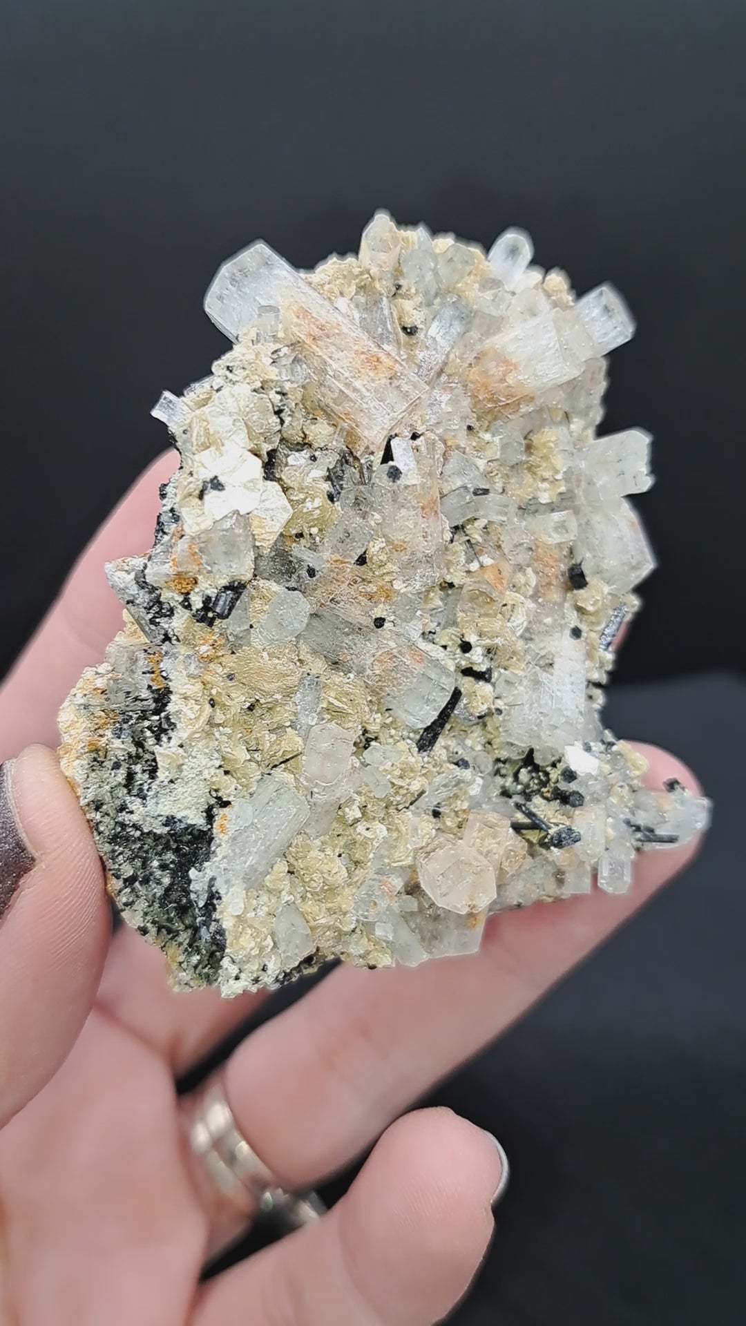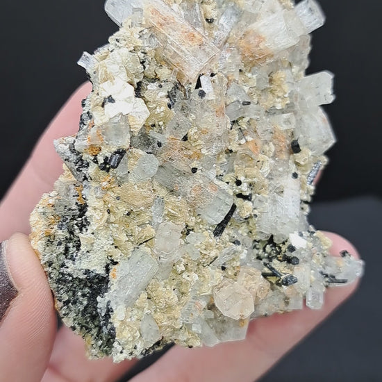 Goshenite is a colorless variation of beryl (blue would be aquamarine). This is a beautiful cluster from every angle! The goshenite and the schorl have great luster, and the muscovite is rich and pearly. Features some large crystals. **Repaired! See close up photo, repair is not really noticeable depending on angle of display. Comes with acrylic easel. Size approx. 3” x 2”. From Erongo Region, Namibia.