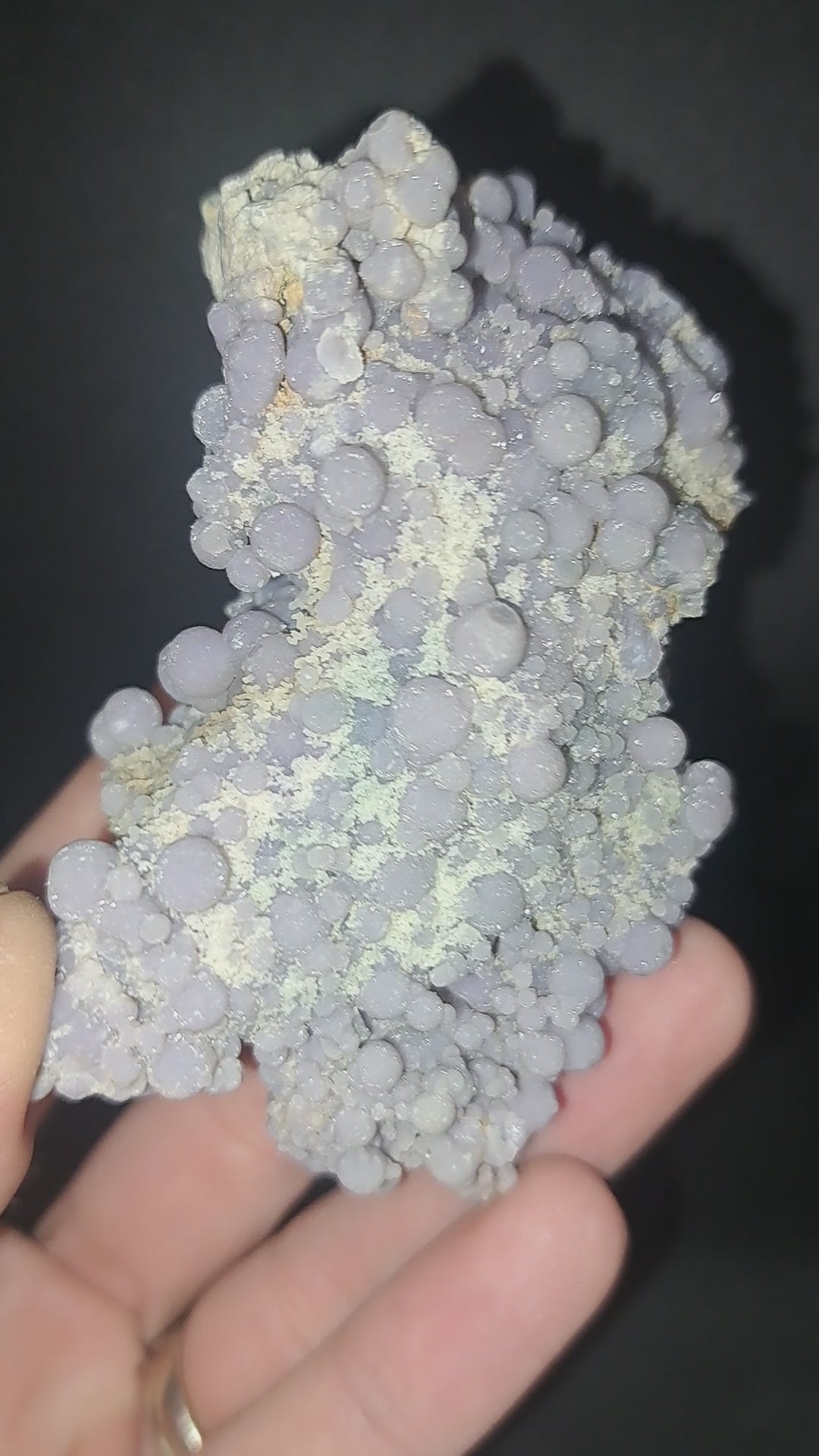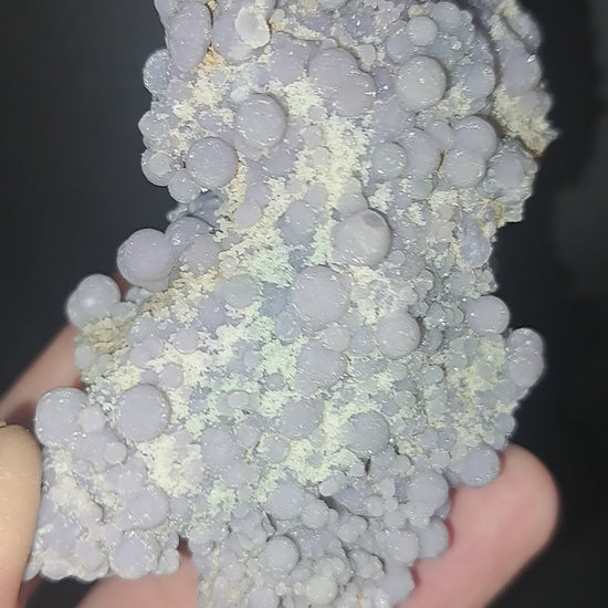 Commonly called Grape Agate, it is not actually an agate. It is a form of chalcedony made up by tiny amethyst crystals forming in botryoidal clusters. The traditional purple color and the shape gave rise to the trade name of Grape Agate. Colors can range from almost white to deep purple, and even blues and greens. This piece has a bit of lavender to blue ombre coloring and looks great on the small specimen stand (sold separately). Approx. 3.5", from Indonesia.