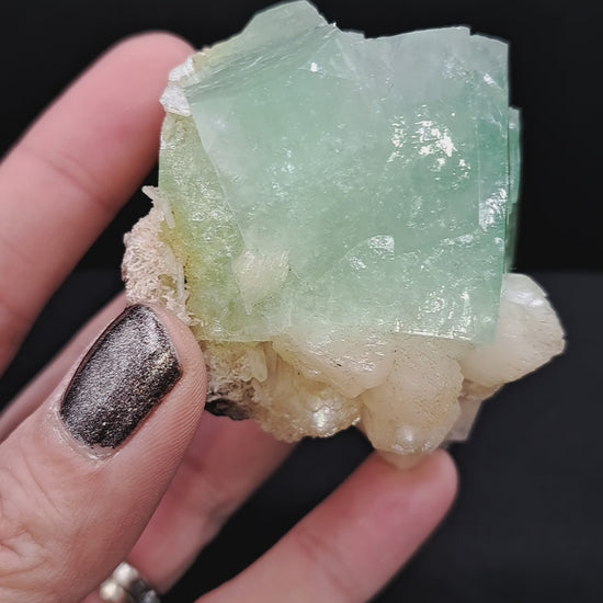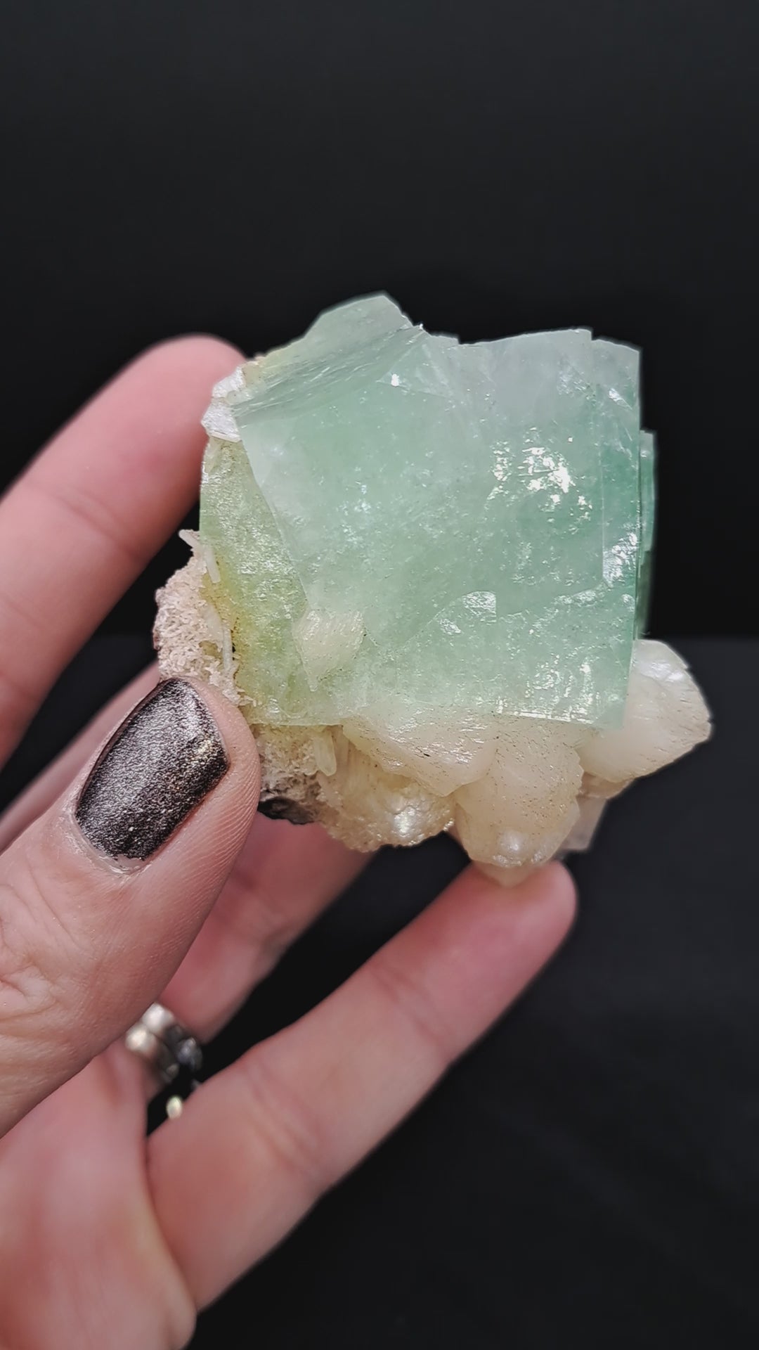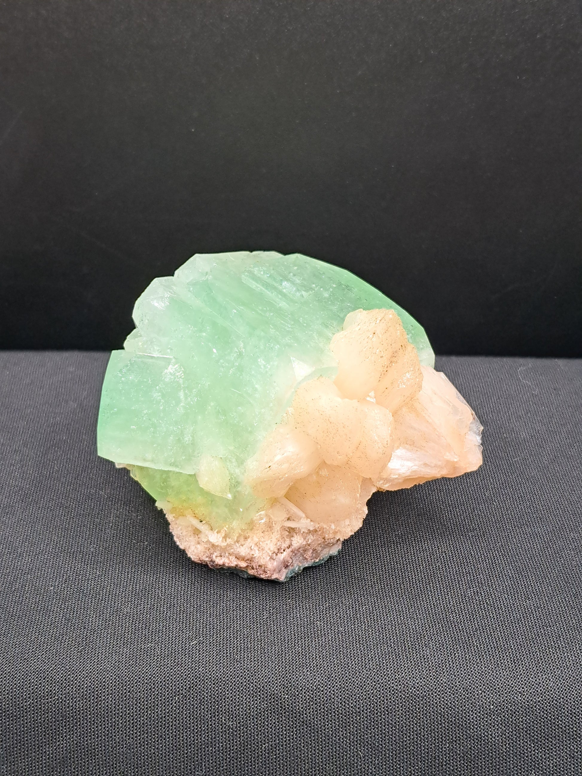 Large glossy vibrant green apophyllite cubes, with an accent growth of peach stilbite. Looks stunning on a small specimen display stand (sold separately). Approx 2.75” wide x 2". Maharashtra, India.