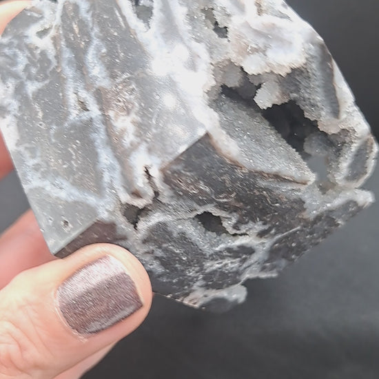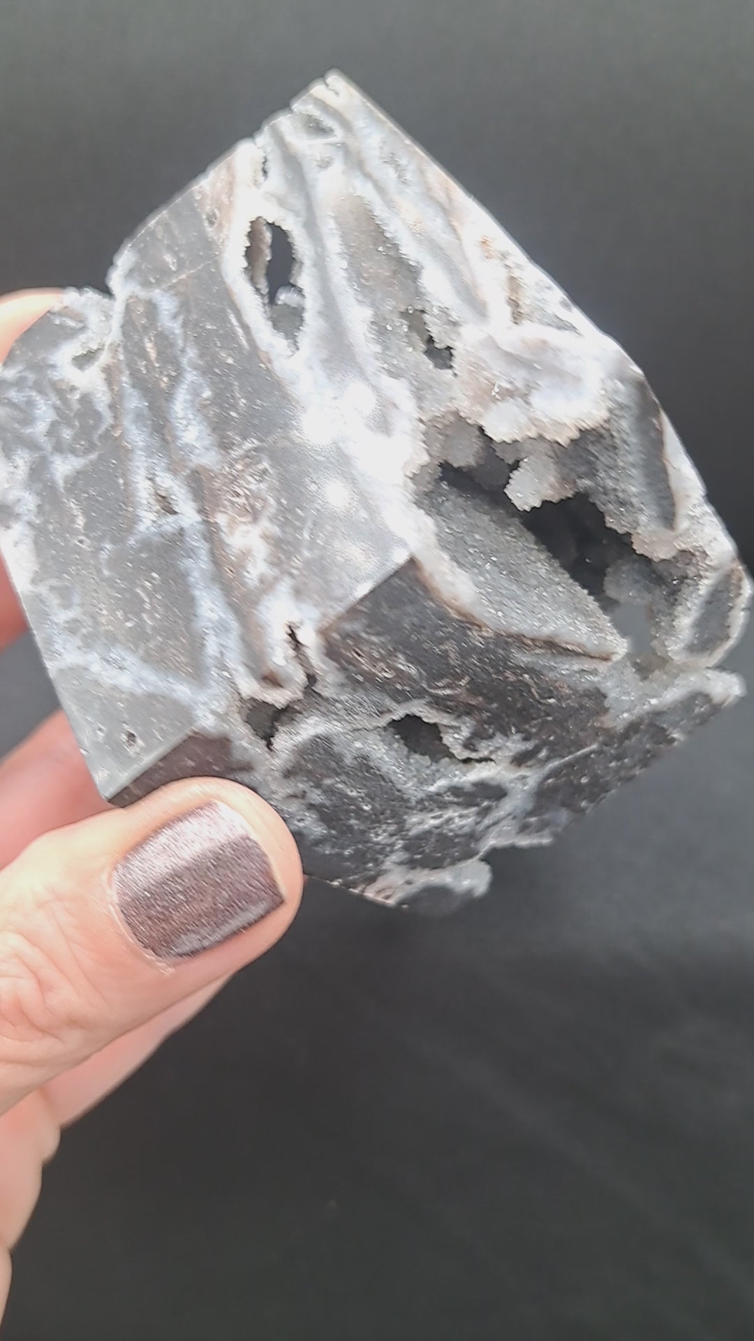 Commonly mis-named as “sphalerite”, it’s actually a brecciated combination of possible materials including limestone, calcite, jasper, chalcedony and sparkly drusy quartz. (That's a mouthful!) With help from other members of the crystal community, I coined the term "Harmony Quartz" to use instead of the incorrect label. 2.5"x2.5"x2.5". From China.
