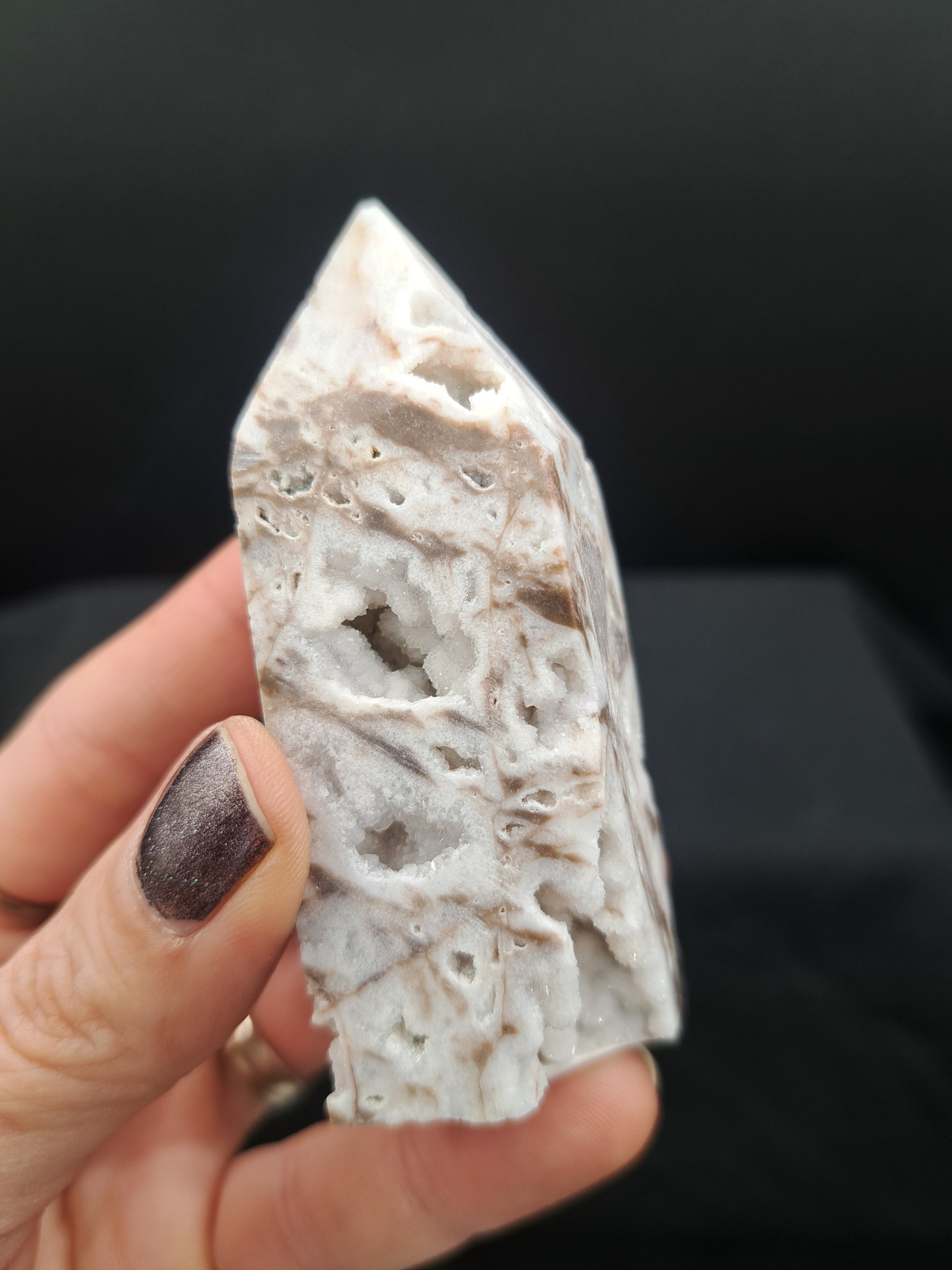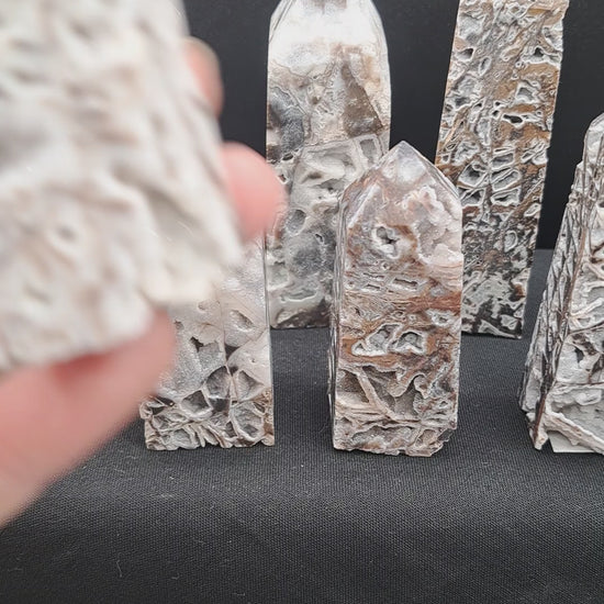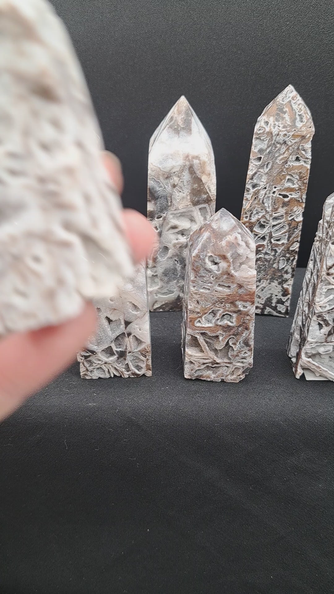 Commonly mis-named as “sphalerite”, it’s actually a brecciated combination of possible materials including limestone, calcite, jasper, chalcedony and sparkly drusy quartz. (That's a mouthful!) With help from other members of the crystal community, I coined the term "Harmony Quartz" to use instead of the incorrect label. Lettered A-G matches from front to row left to right, and then back row left to right. From China.