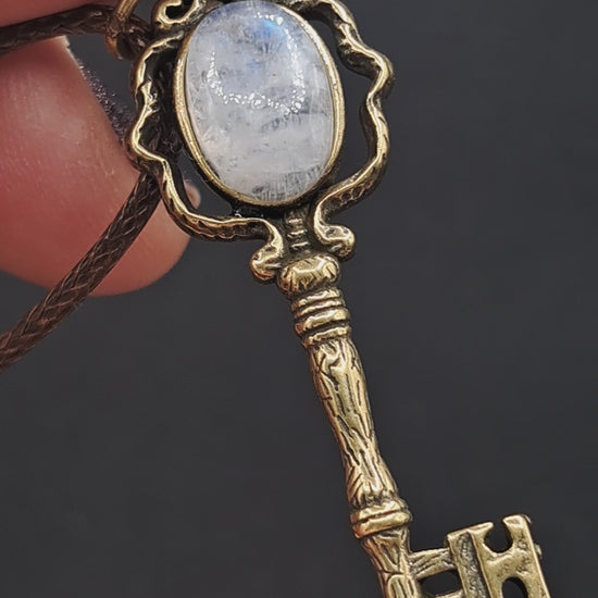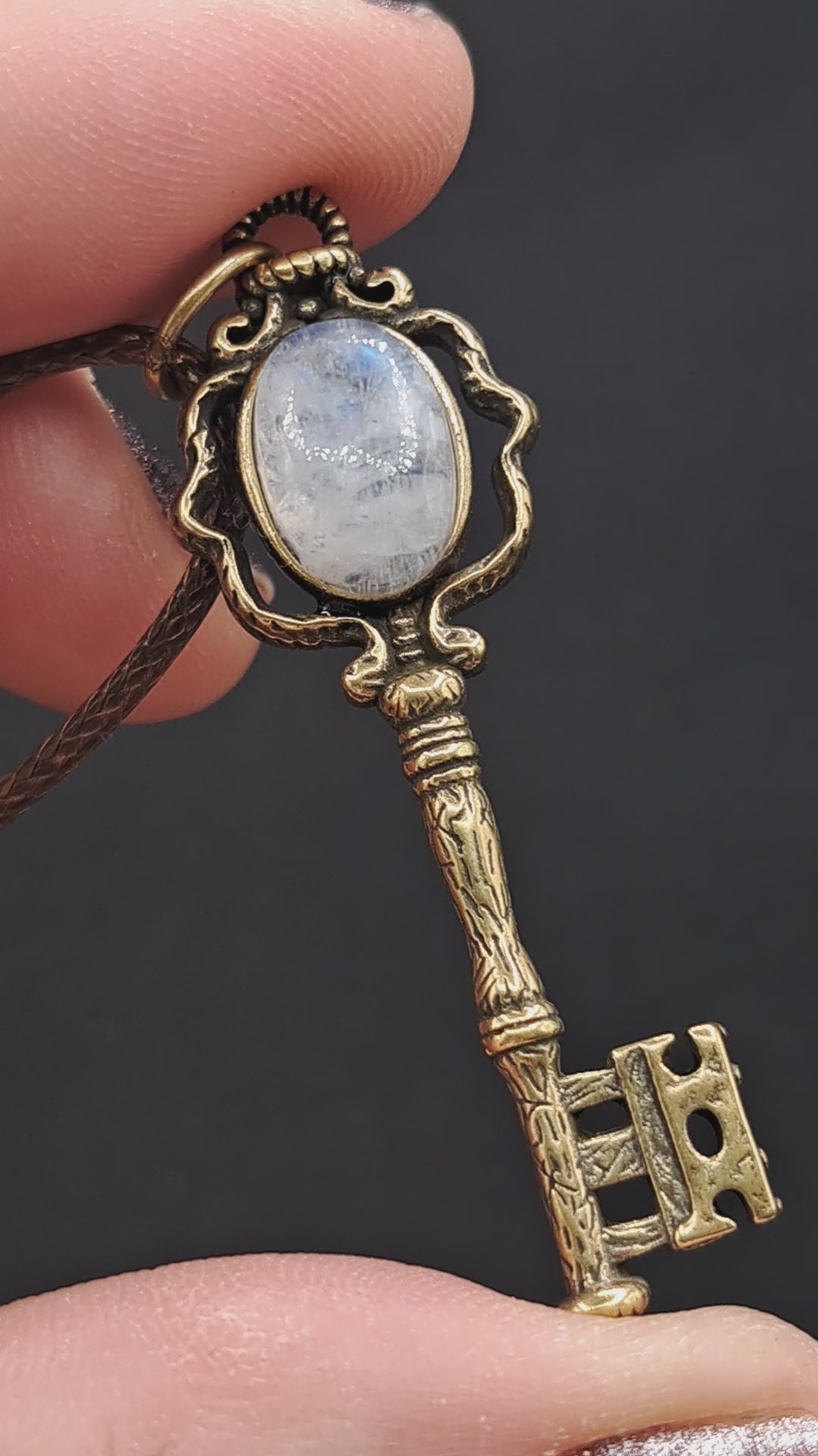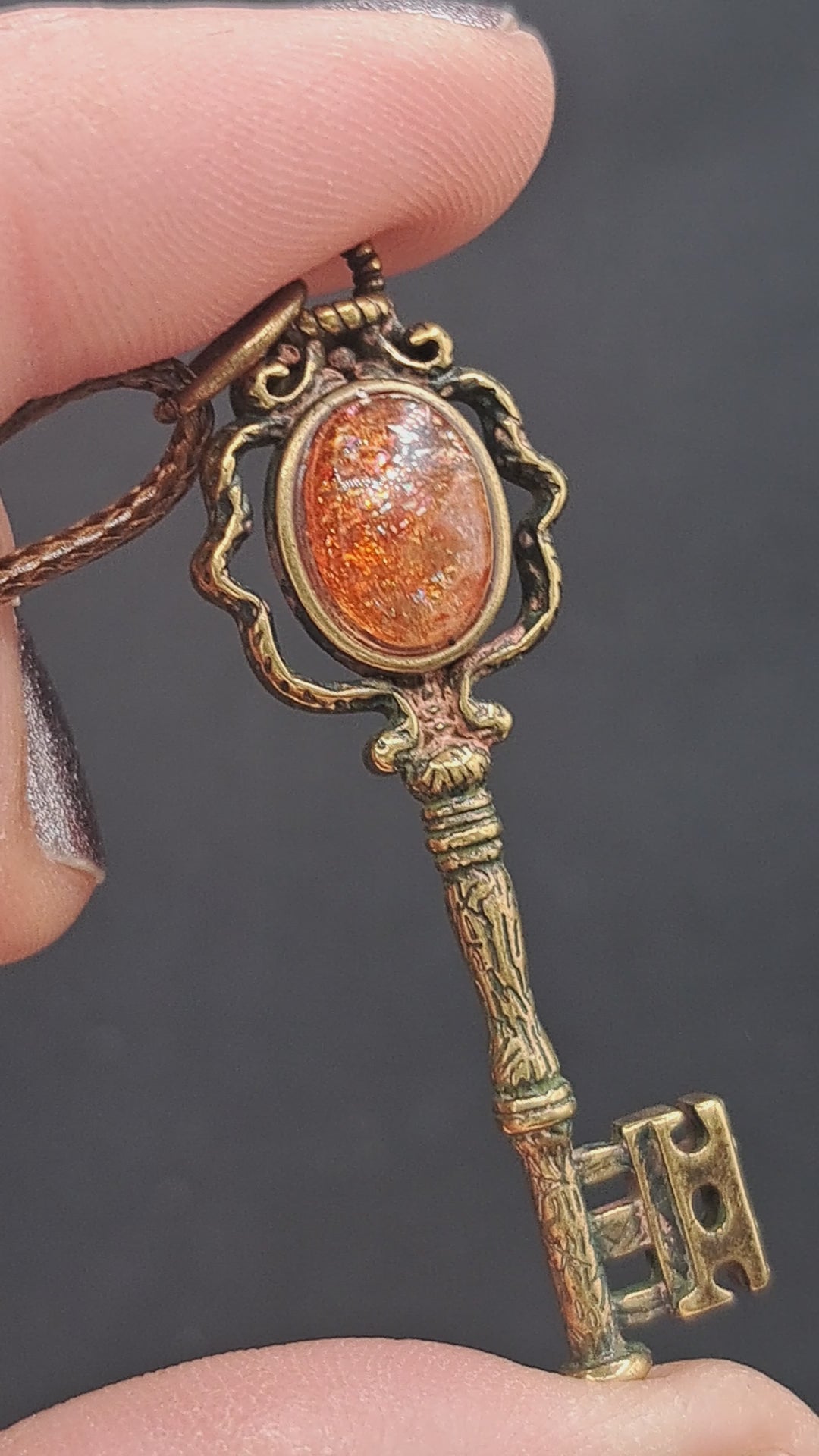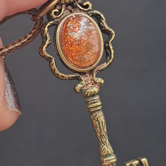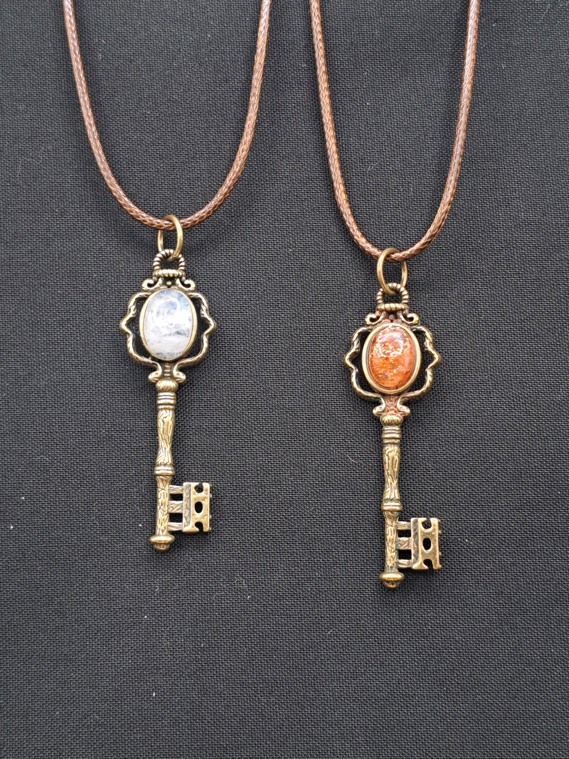 Choose between flashy Sri Lanka moonstone and sparkly Mozambique Sunstone. Natural variation in stone can exist. Comes with 18" brown chord with a 1.5" extender chain to match antique brass style of pendant. Approximate length of pendant is 2".