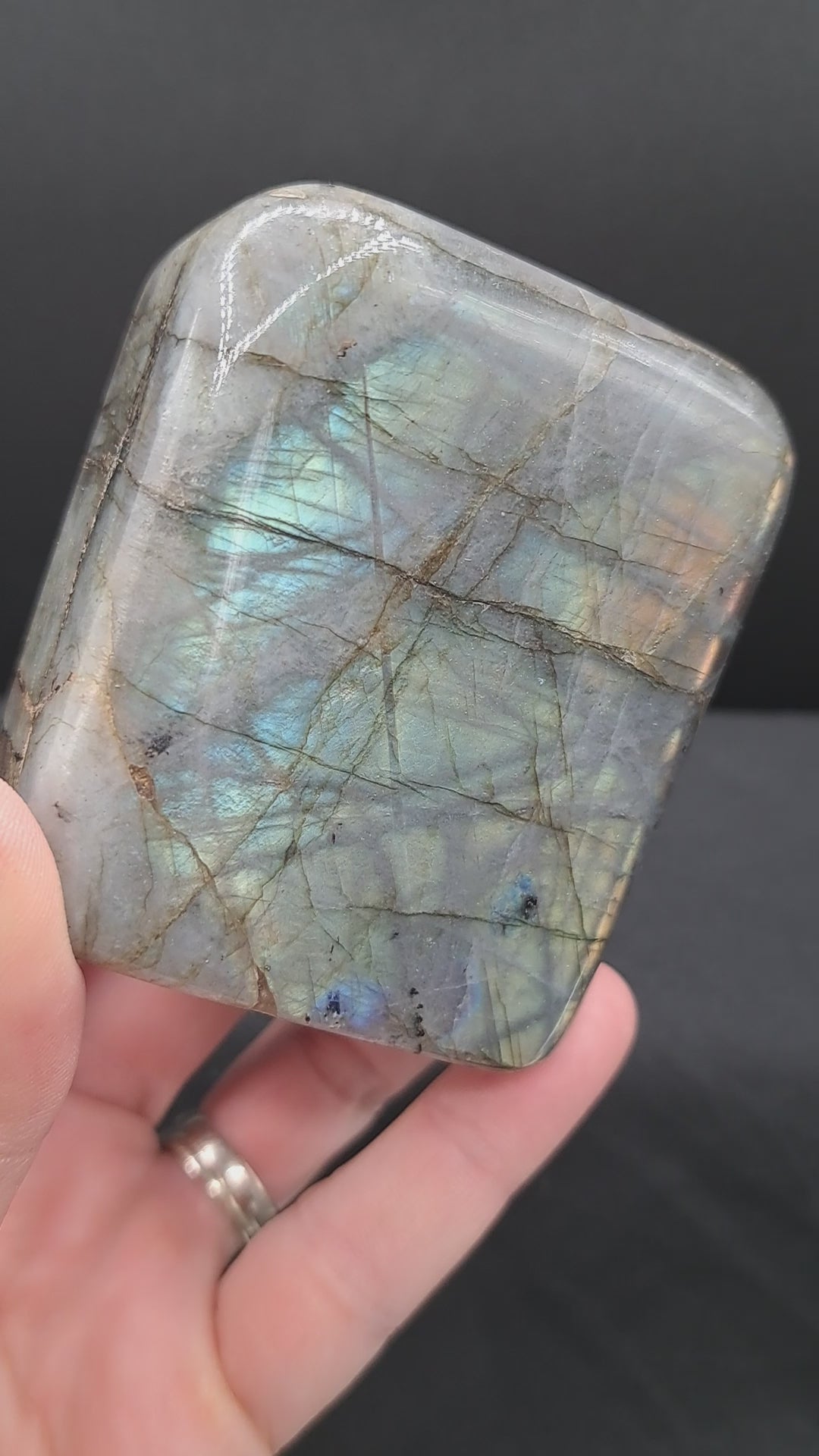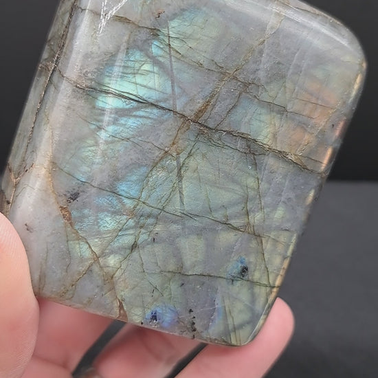 Dual full face flash on the front, with orange, yellow and blues. Small amount of similar flash on the back. Size is 2.5" wide, 1.5" thick, and 3" tall. Weighs just over 1 lb. From Madagascar.