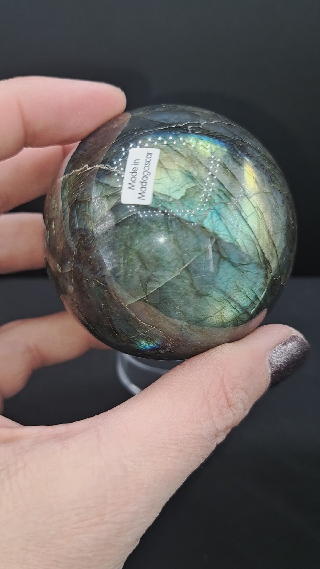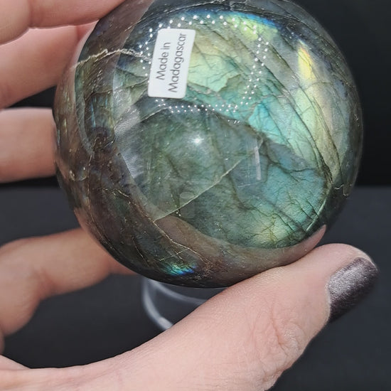 Beautiful, high quality labradorite sphere. Multi-color rainbow flash! Comes with acrylic sphere holder. Approx 2.52” (64 mm). From Madagascar.