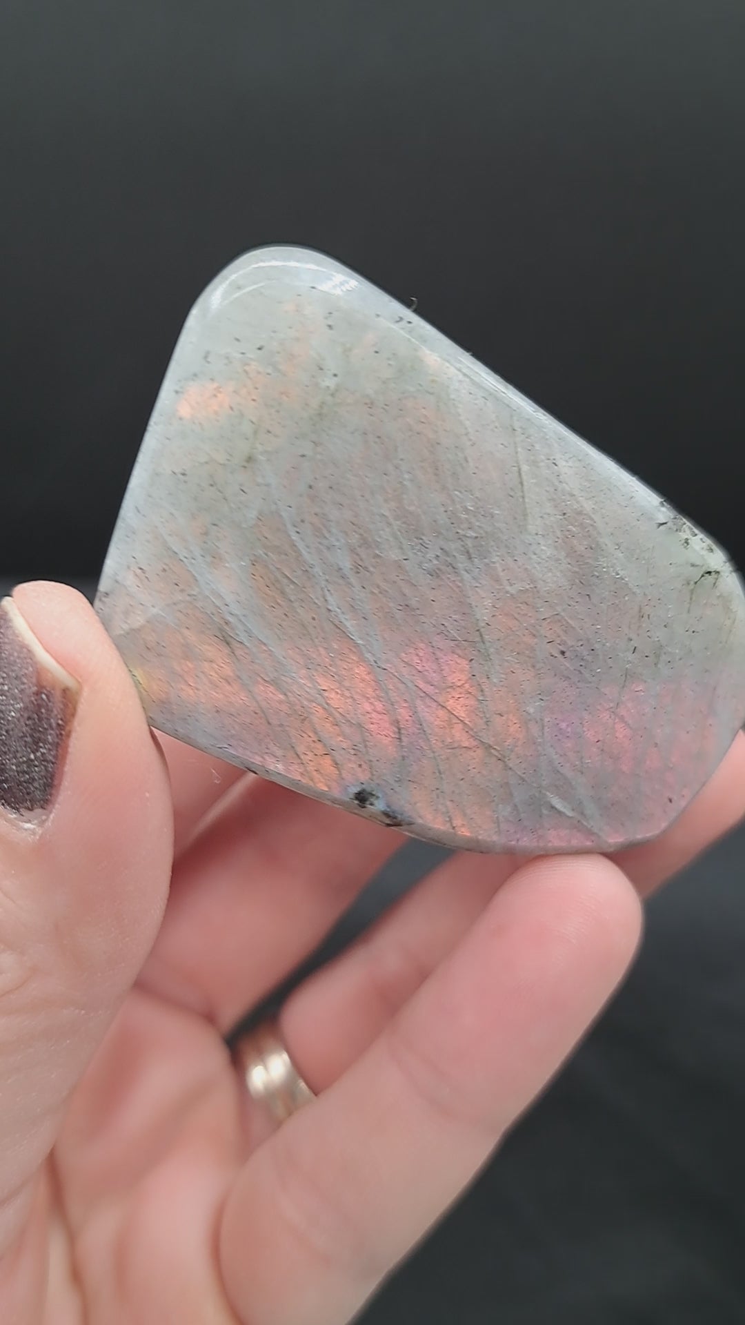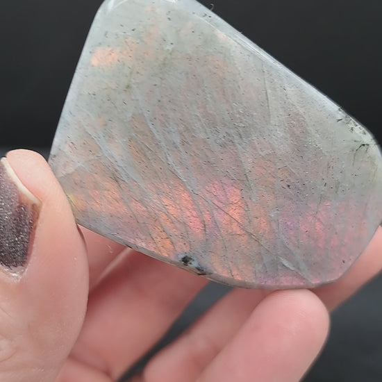 Full face flash on the front, with yellow to orange to purple. Minimal flash on the back. Size is 2.25" wide, 1" thick, and 1.5" tall. From Madagascar.