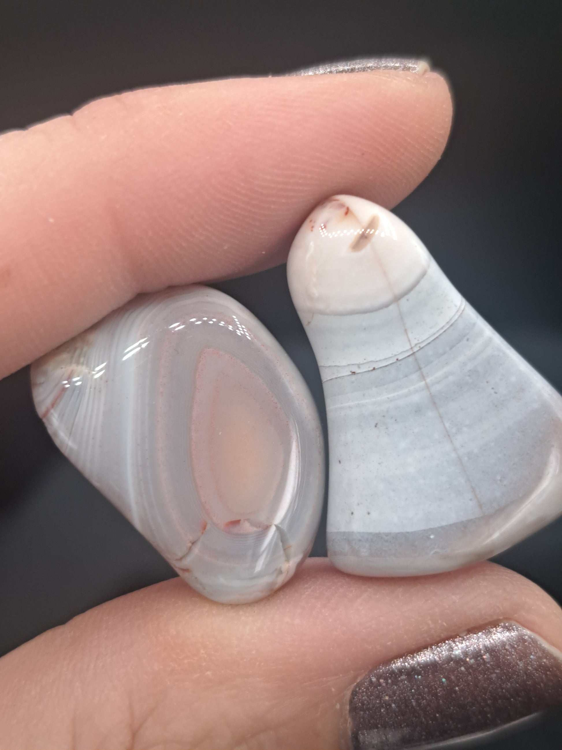Gorgeous swirls and banding in pastel blues, pinks, grey and white. Price is for individual tumble, photo is representative of batch. Size approx. .75"-1". From Botswana.