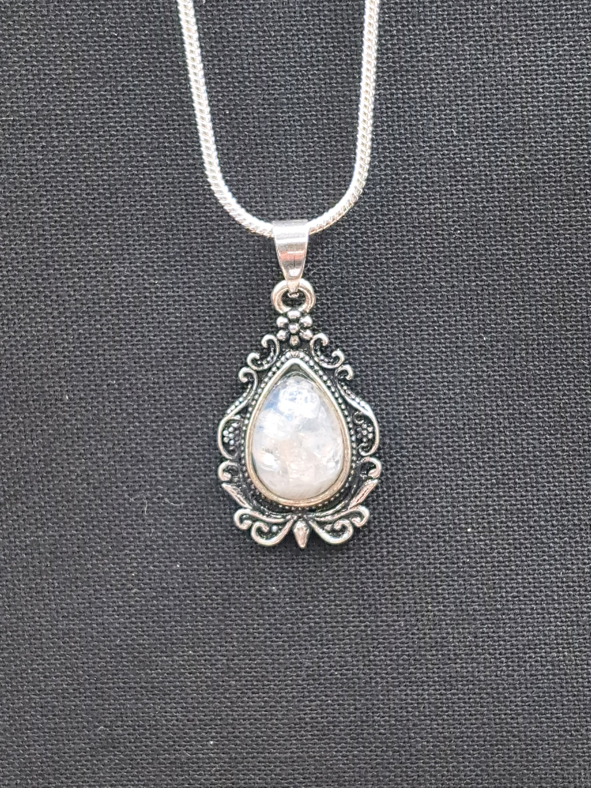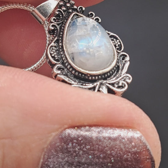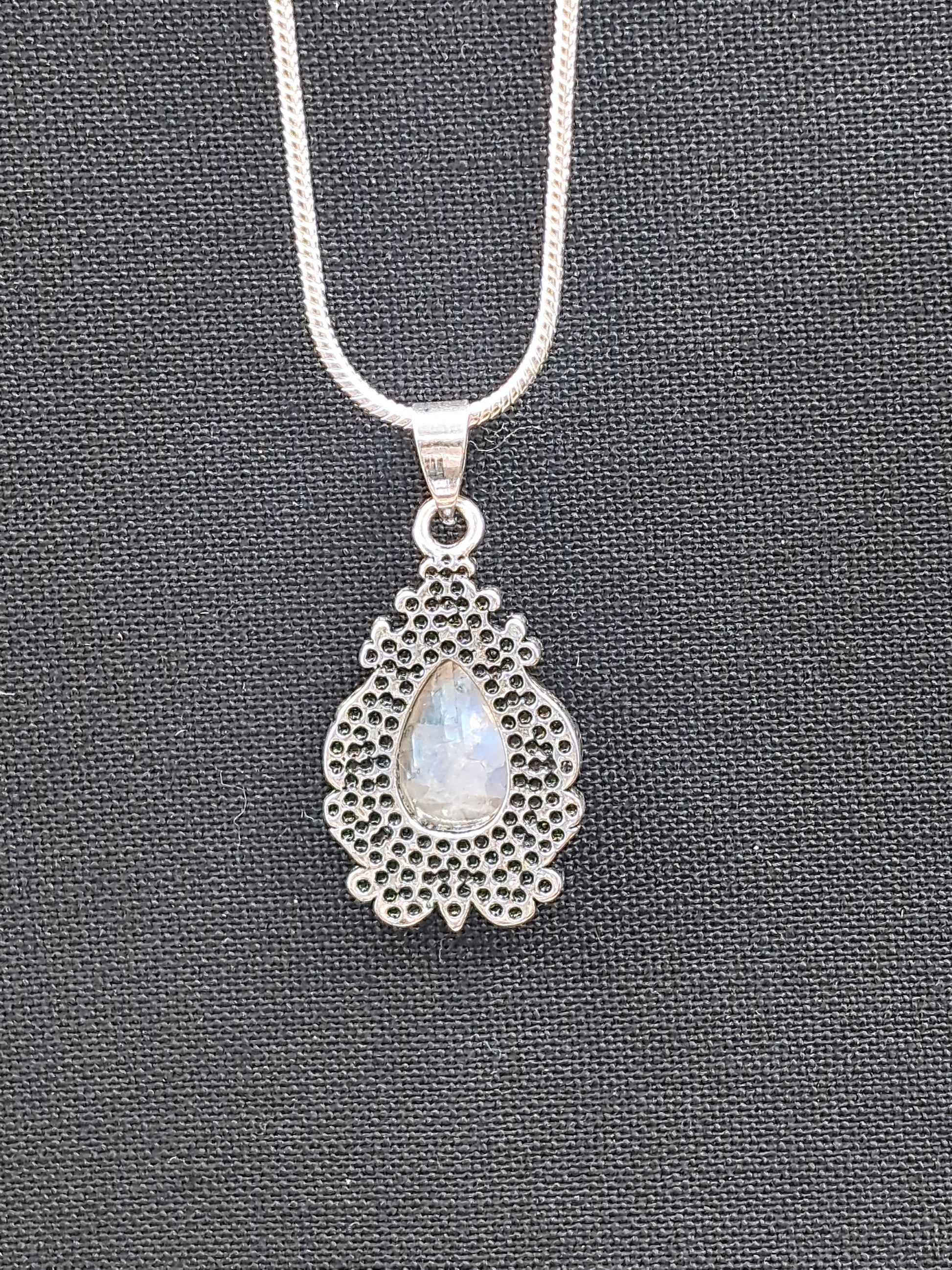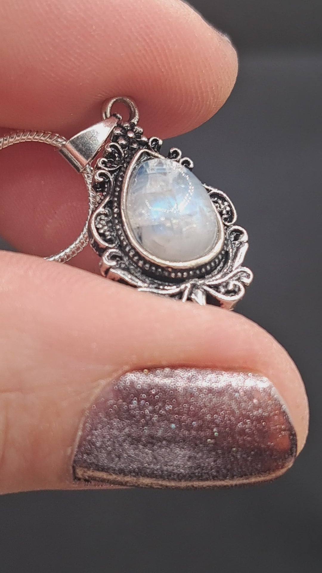Beautiful domed teardrop pendant of flashy Sri Lanka moonstone. Natural variation in stone can exist. Comes with 18" silver plated chain. Approximate length of pendant is 1".