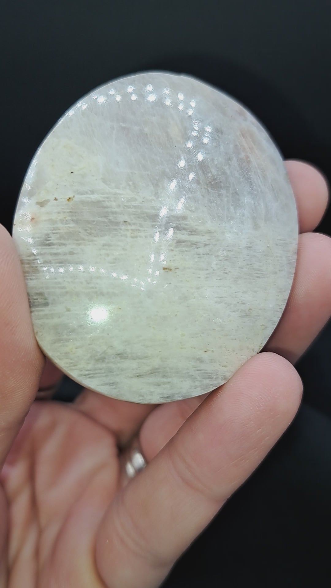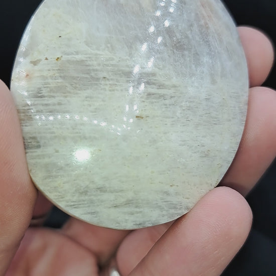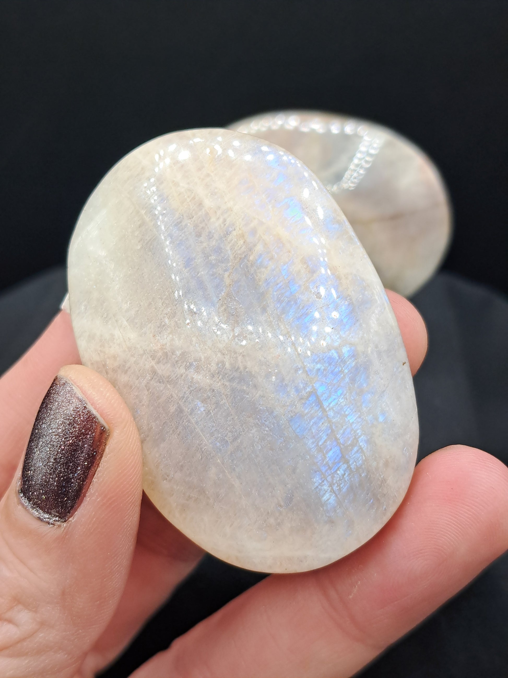 Blue flash moonstone shows off in a flat pillow shaped palm stone. Some pieces have additional orange shimmery sunstone. Photo is representative of batch, will be intuitively chosen. Choose which size is best for you. Shape varies slightly. Mini is approx. Small are approx. 1.5" - 2" long, Large are approx. 2.25" - 2.75". From Tanzania. Plastic easel is for photo only, not included.