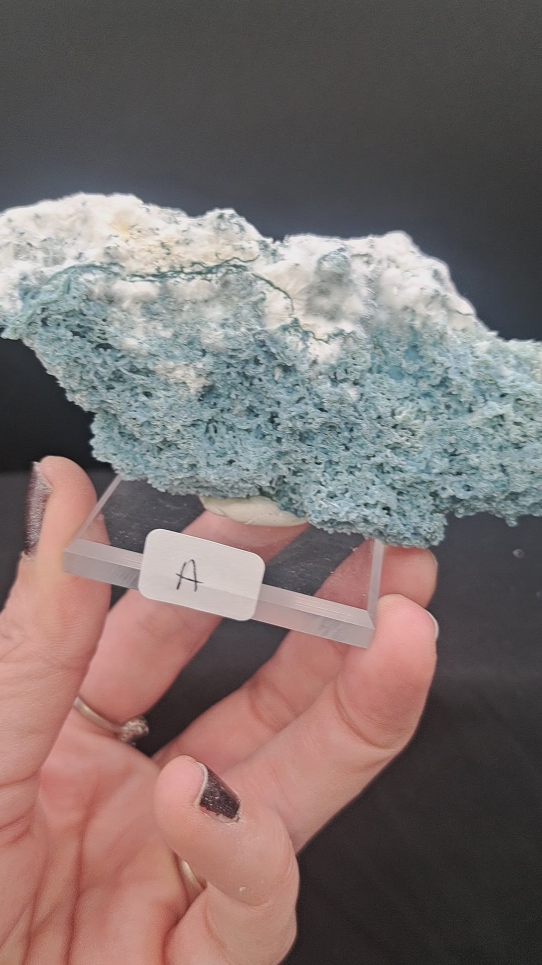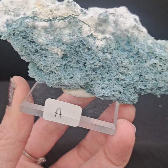 These unique specimens are enjoyable from every angle! Delicate okenite gently coats the blue chalcedony. They have great contrast! Mounted on a 2” acrylic bases. A is approx. 4" x 2.25" and B is 2" x 3". From Maharashtra, India.