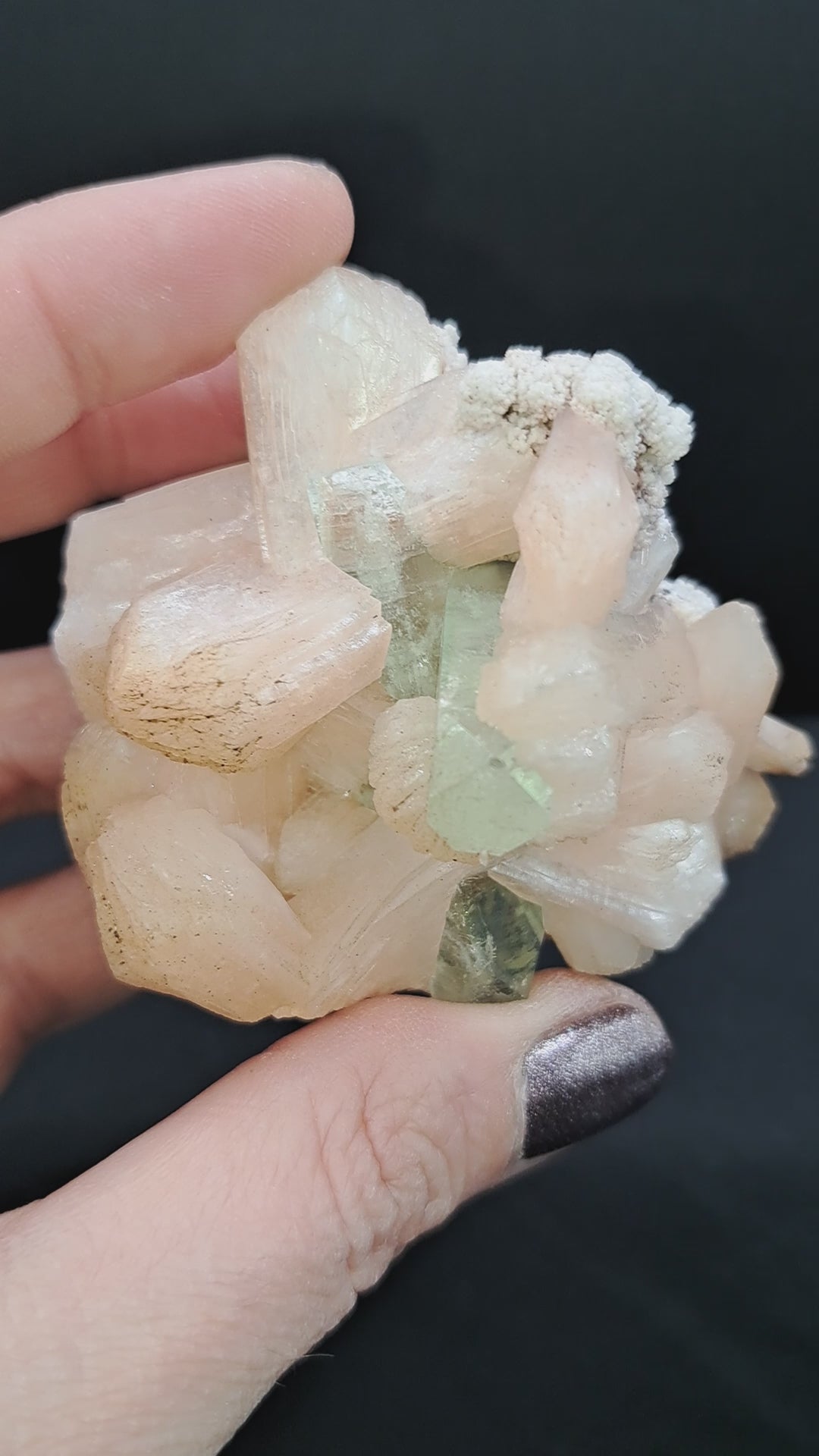 A beautiful cluster of stilbite surrounding 2 green apophyllite crystals. Looks great on the small specimen stand or can be displayed flat. Approx 2.75” x 2.5". From Maharashtra, India.