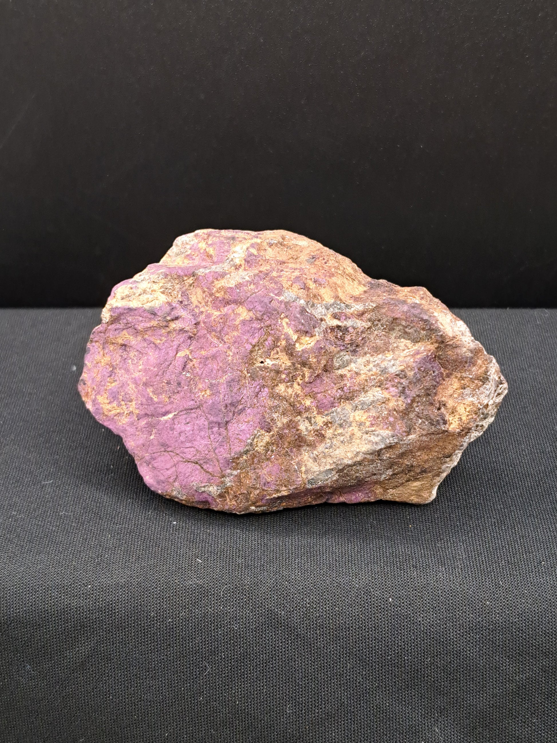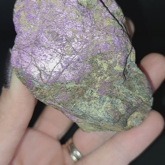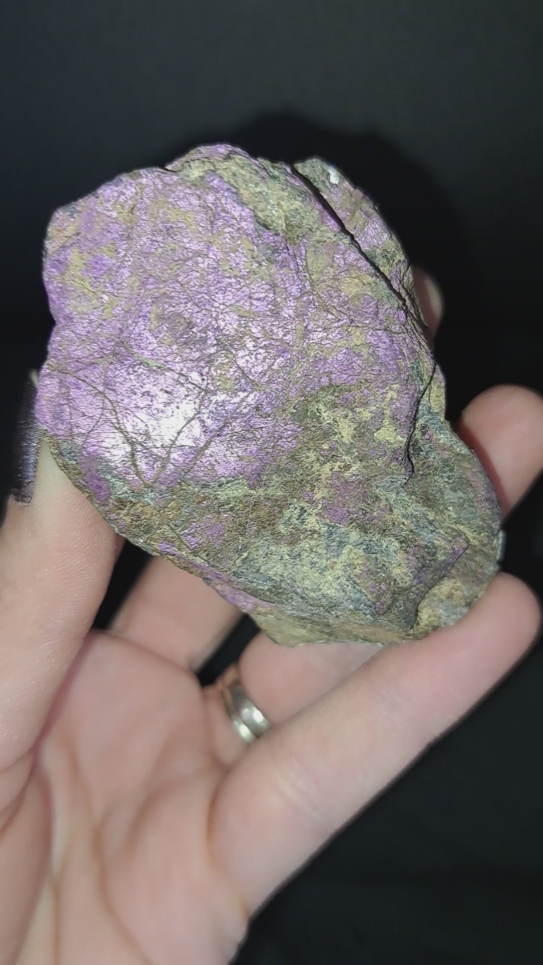 Beautiful metallic flash purpurite forms in veins and will have either a dark velvet color or the metallic flash, depending on the angle of light reflection. VERY difficult to catch metallic flash in photos. Approx 3” long. From Erongo, Namibia.