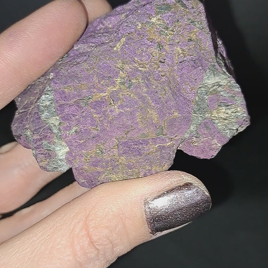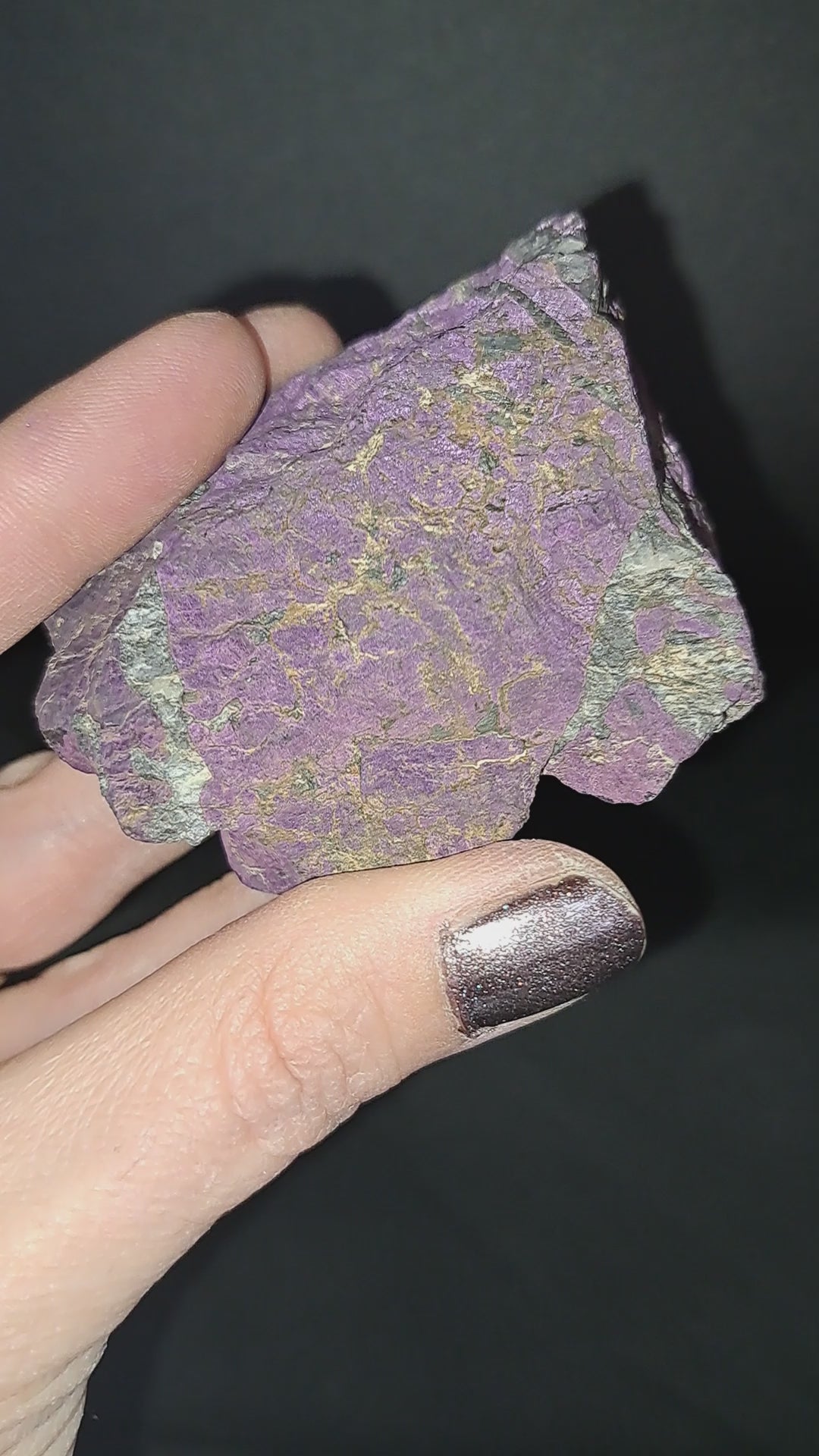 Beautiful metallic flash purpurite forms in veins and will have either a dark velvet color or the metallic flash, depending on the angle of light reflection. VERY difficult to catch metallic flash in photos. Approx 2.5" x 1". From Erongo, Namibia.