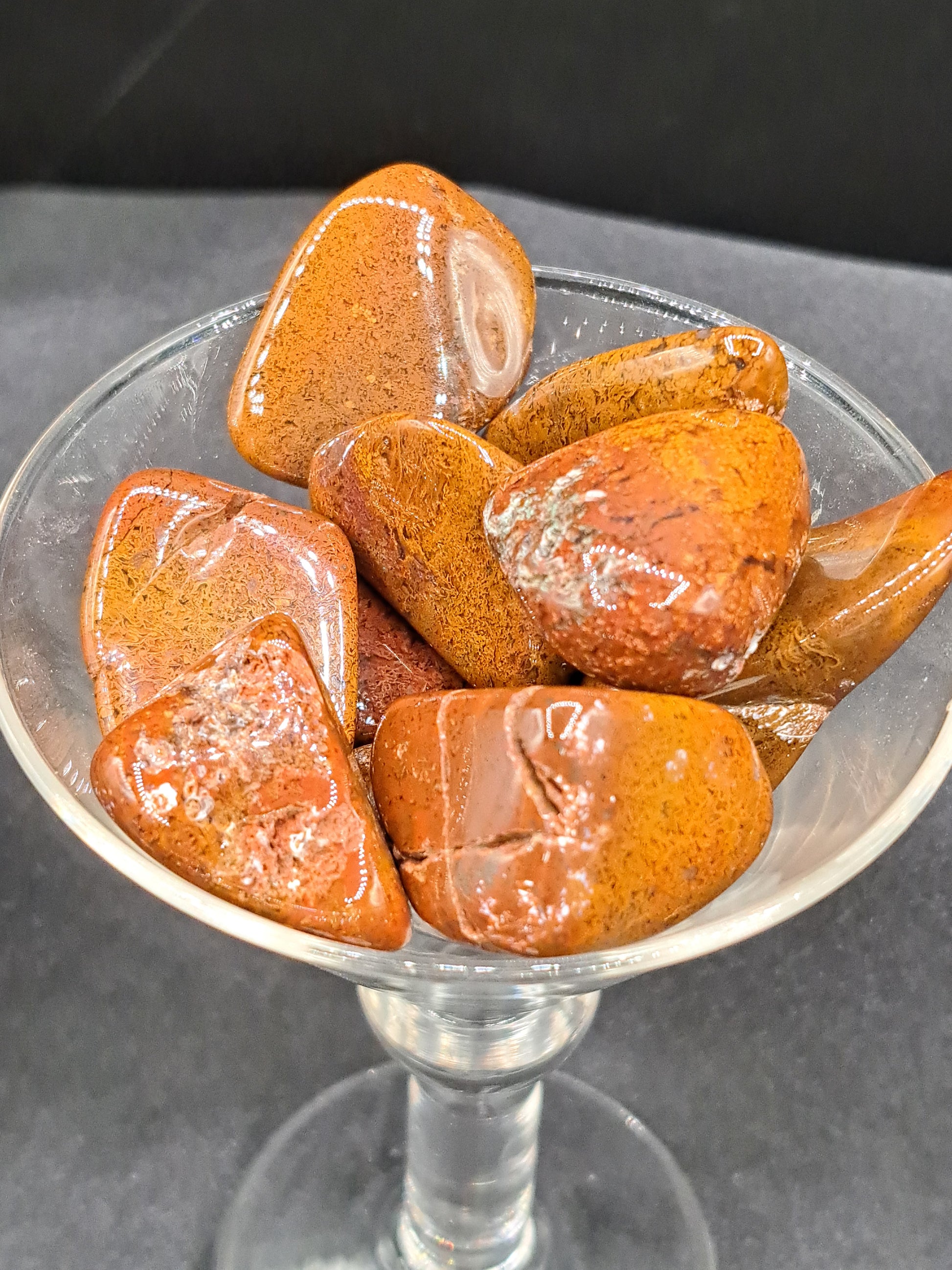 These are "Tumbled by Rachel". After spending weeks in varies stages of grit and then polish, I am happy to present these beautiful tumbles of red moss agate from Montana, USA. Color ranges from brown to burgundy. Price is for individual tumble, picture is representative of batch. Size is approx. 1"-1.5".