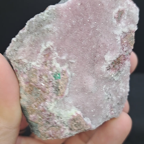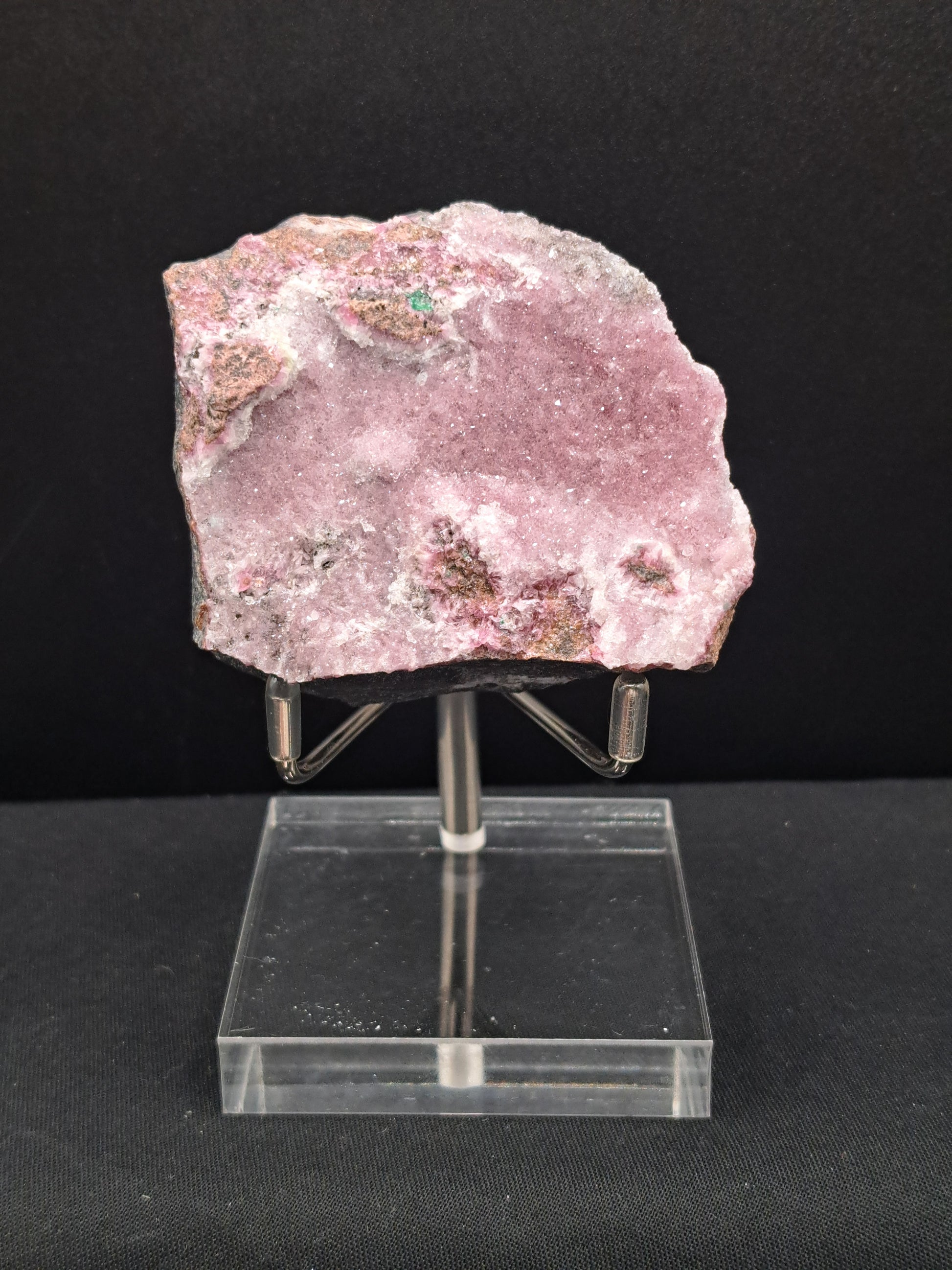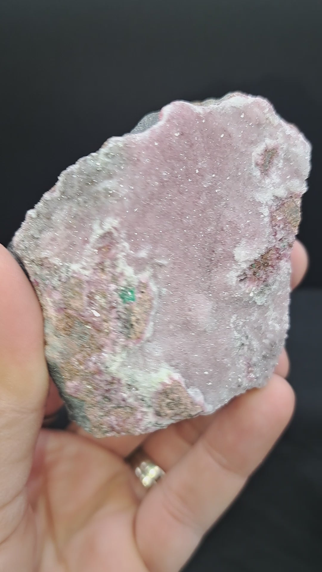 Sugary soft pink crystals with a touch of malachite. Can self-stand, or looks great with display (sold separately). Approx 2.75”. From Kakanda, Congo.