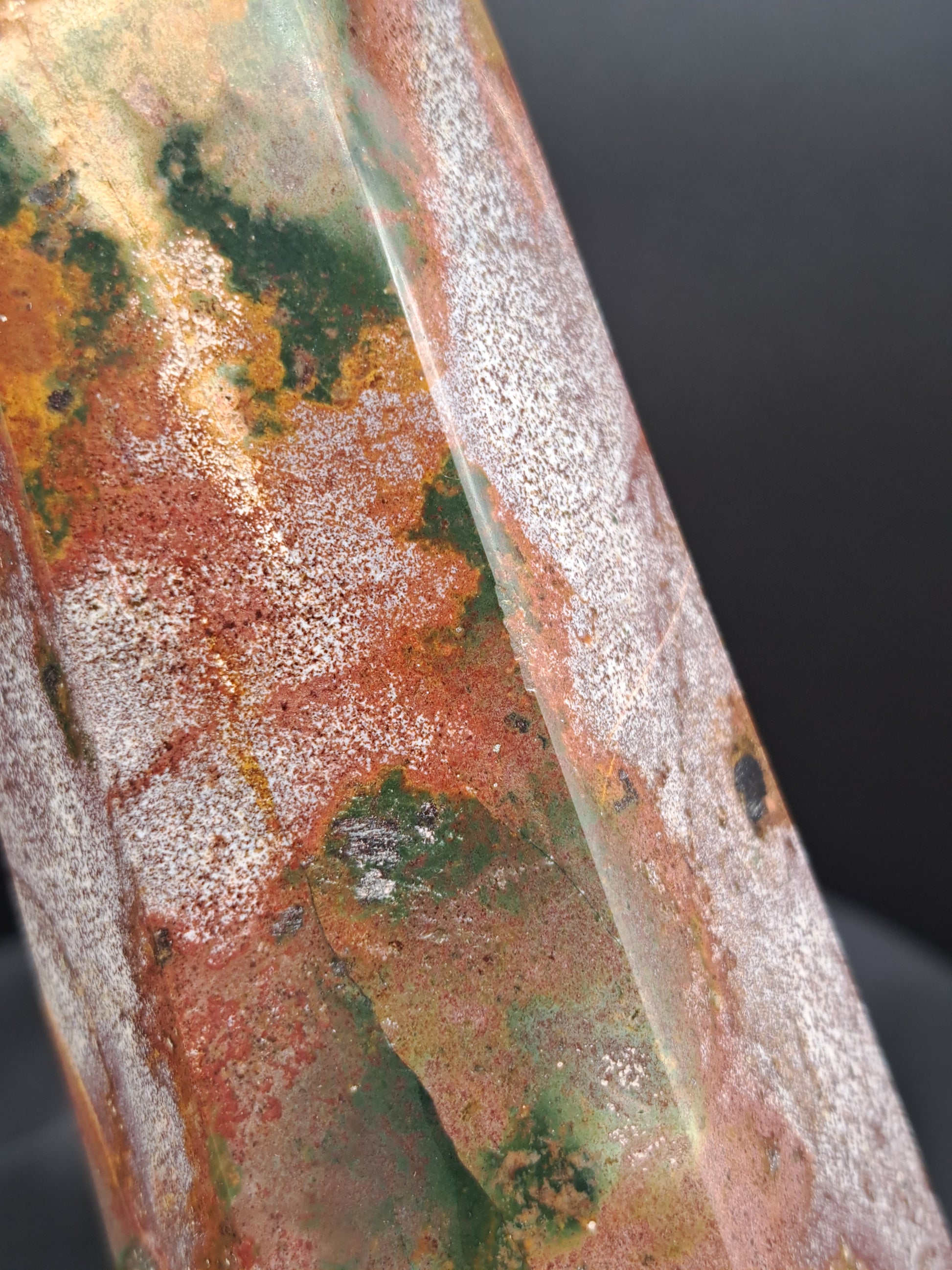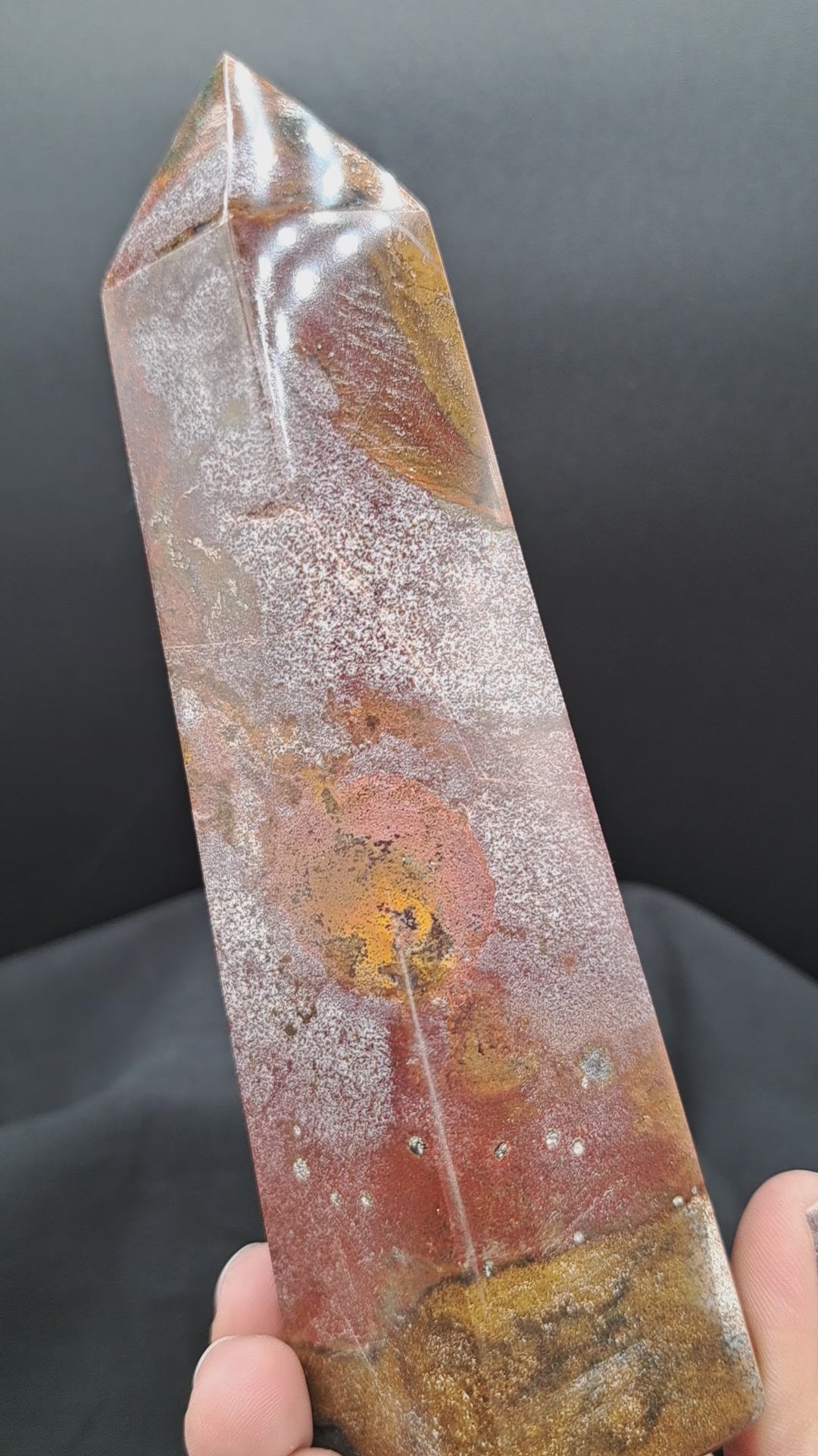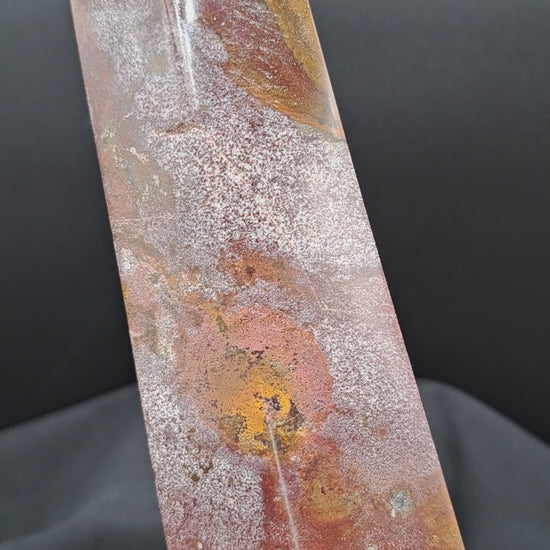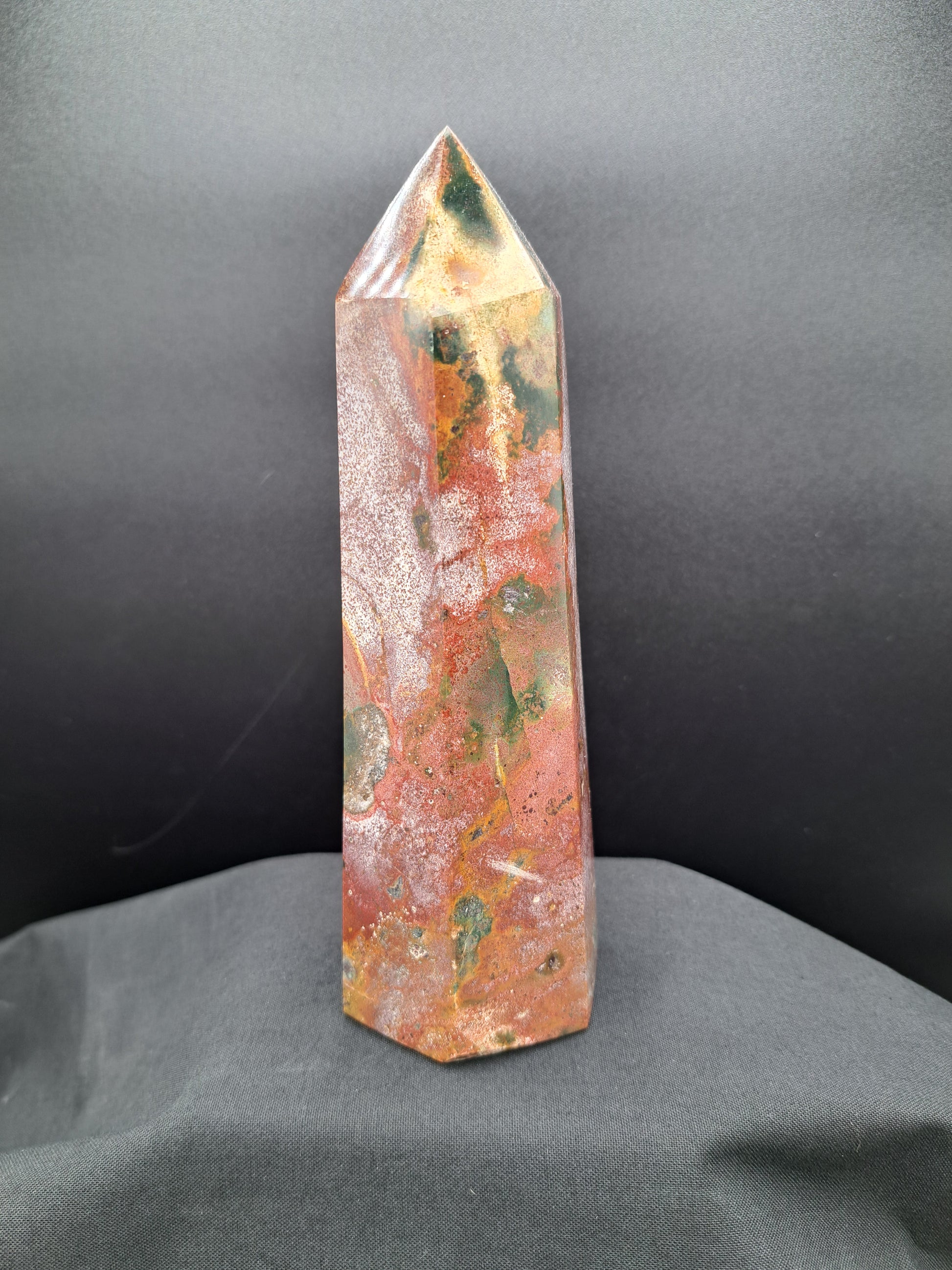 Sea Jasper (commonly mislabeled as Ocean Jasper) comes from Madagascar. This beautiful chunky tower is swirled with burgundy, brown, green, and white. Stands 7" tall and is 2.25" wide.
