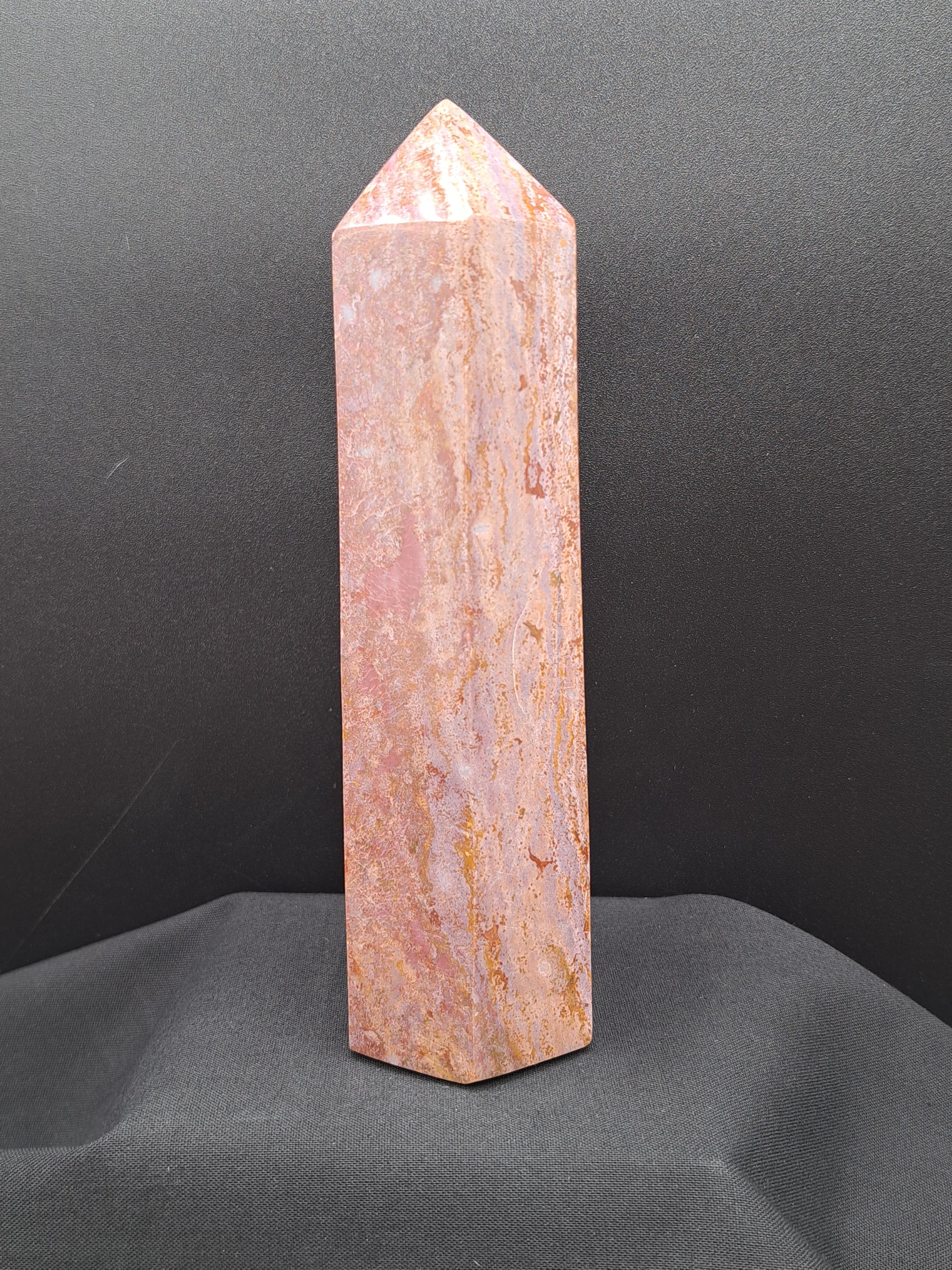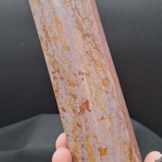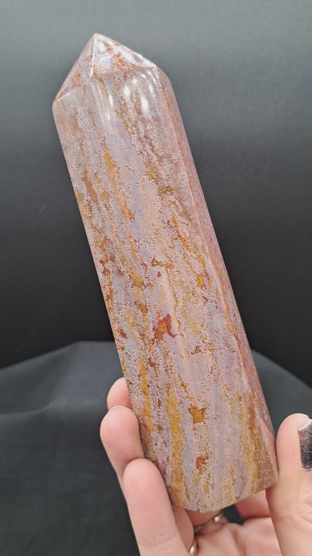 Sea Jasper (commonly mislabeled as Ocean Jasper) comes from Madagascar. This beautiful thick tower is swirled with mauve and brown. Stands 6.5" tall and is 1.5" wide.