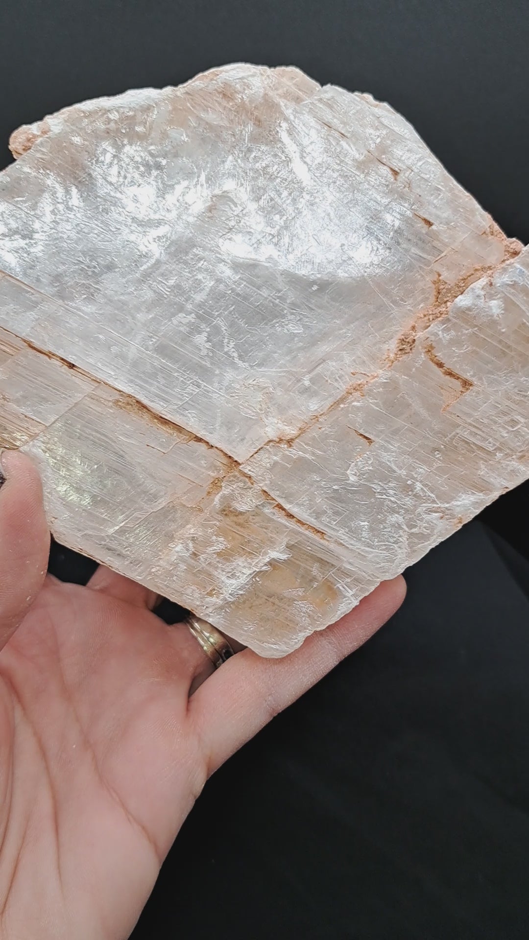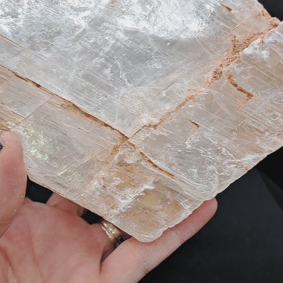True selenite in its completely raw form. It is completely glossy and has well defined layers giving it the appearance of a "book" from the side. comes with an adjustable acrylic stand. Approx 6” wide, 1.5” thick, just over 2 lbs. From Utah, USA.