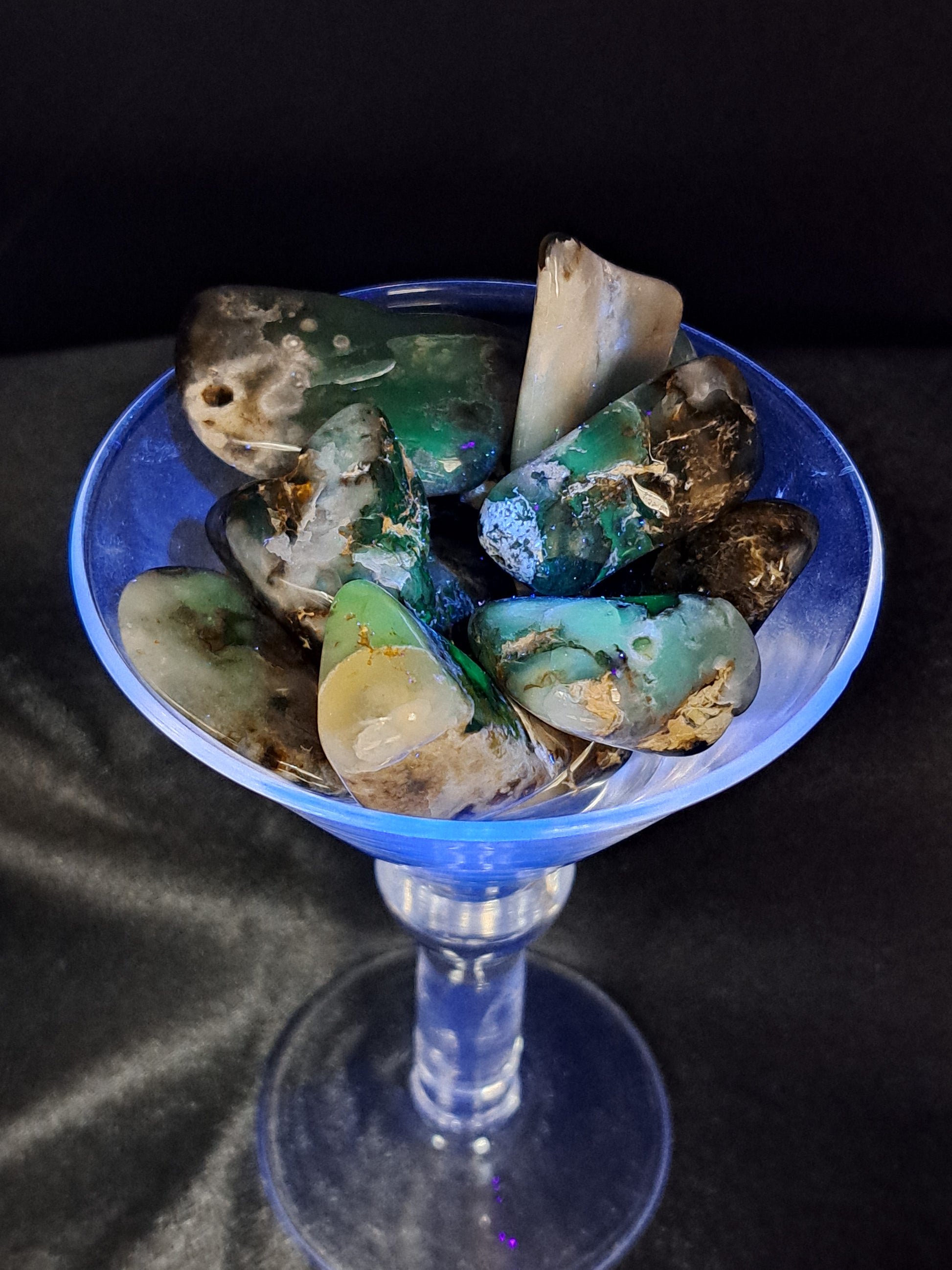 These are "Tumbled by Rachel". After spending weeks in varies stages of grit and then polish, I am happy to present these beautiful tumbles of chalcedony from South Dakota, USA. Color ranges from white to brown, to black. Price is for individual tumble, picture is representative of batch. Size is approx. 1"-1.5". Last photo shows UV reaction with 365nm UV flashlight (available separately in UV kit).