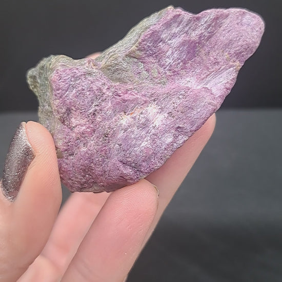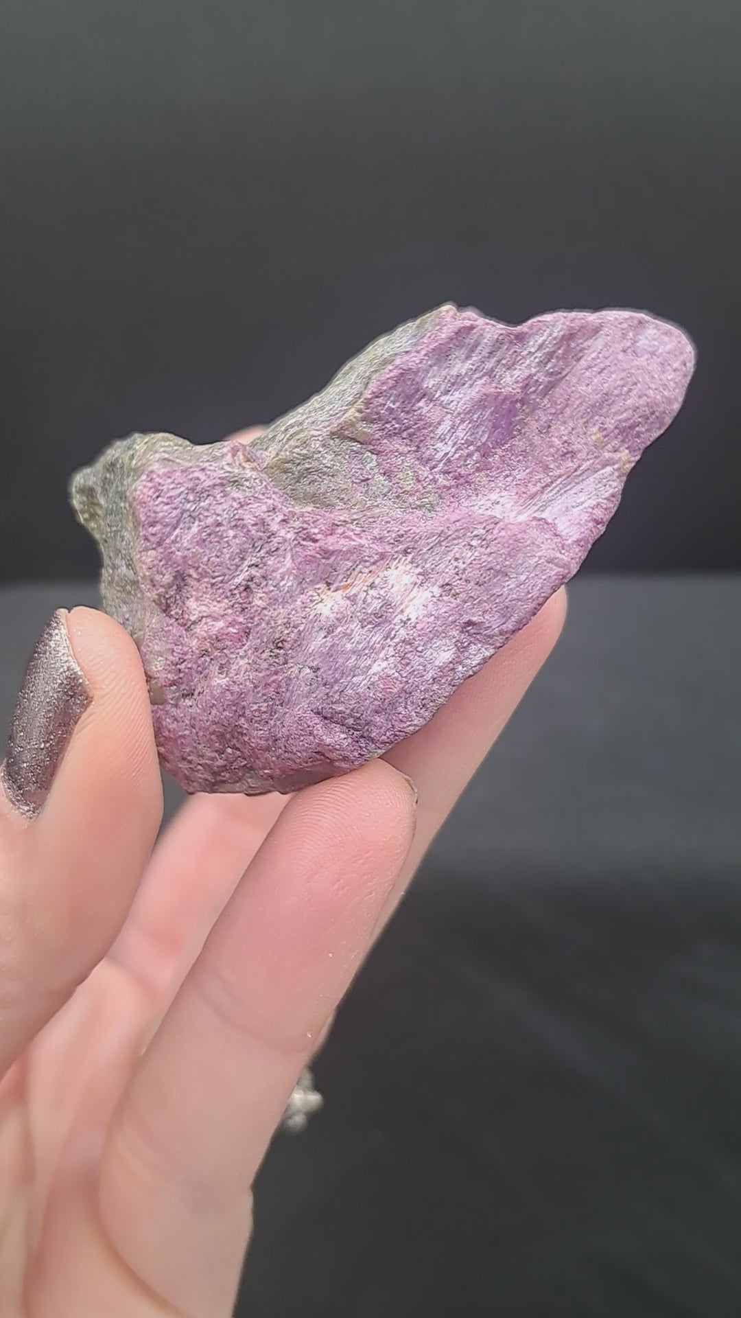 Beautiful lustrous purple stichtite mingles with deep shiny green serpentine to form a combination commonly called Atlantisite. Approx 3” long. From Barberton, South Africa.