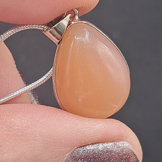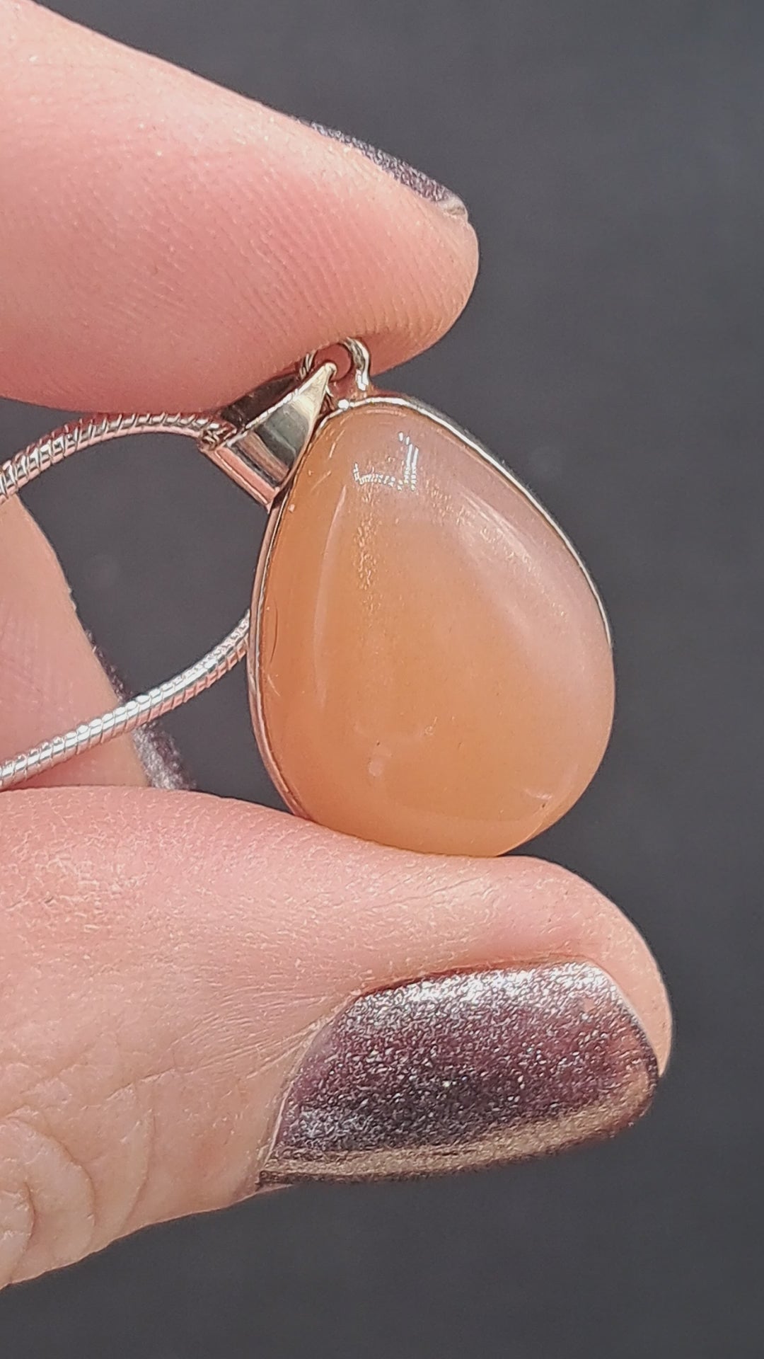 Beautiful dome shaped peachy orange sunstone has subtle shimmer. Comes with 18" silver plated chain. Approximate length of pendant is 1".