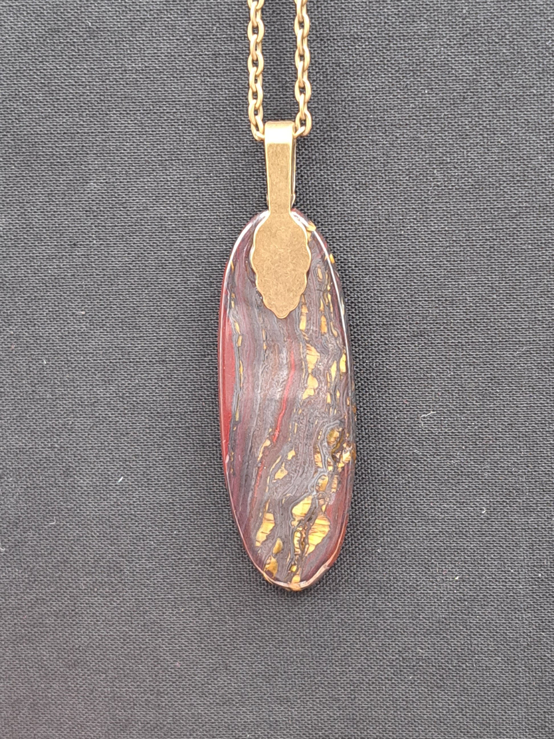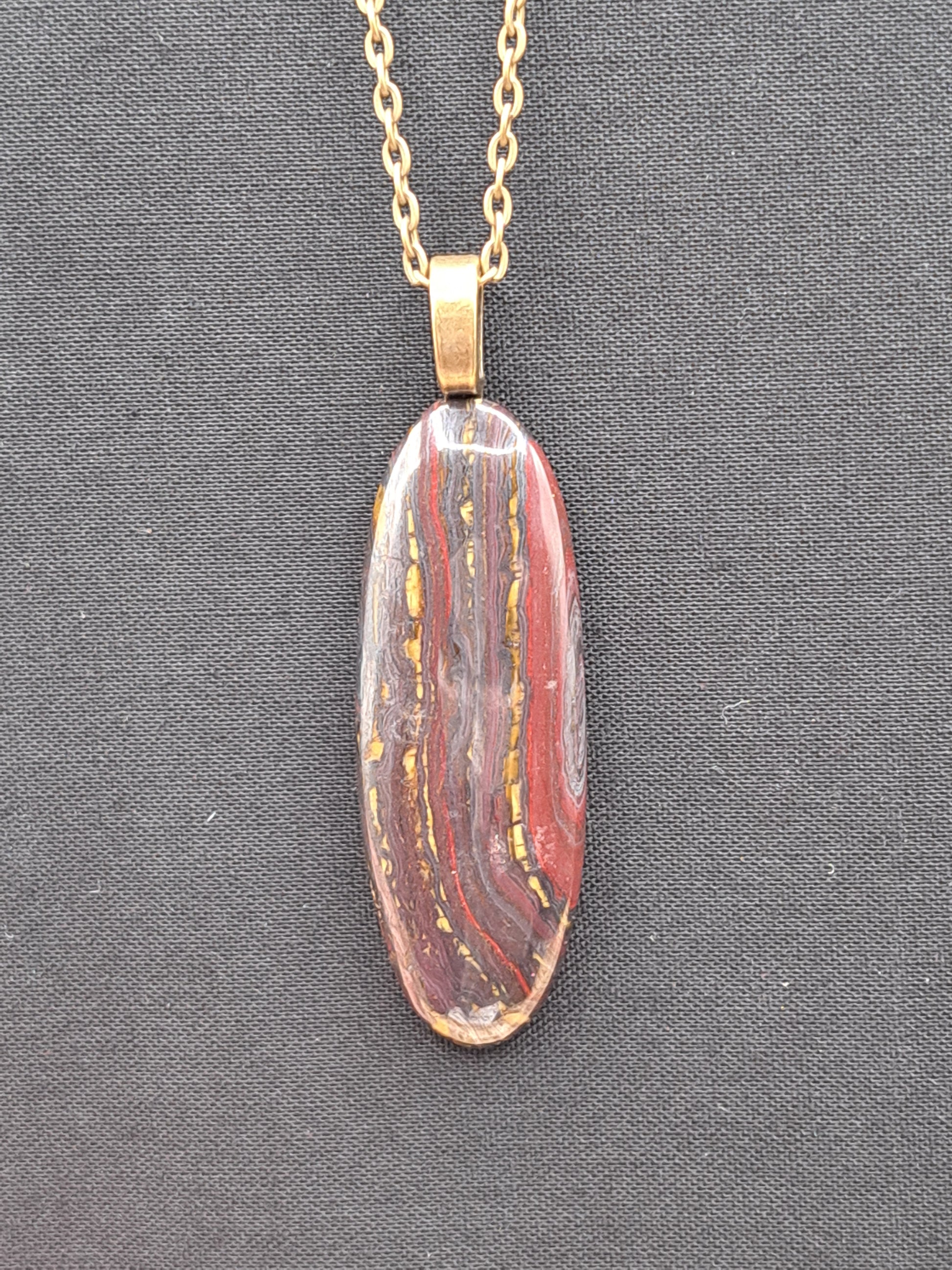 Tiger Iron (also known as Red Tiger's Eye) has flashy gold banding. Cabochon attached to matching bail with reliable E6000 adhesive by Rachel. Comes with 18" antiqued brass colored chain. Approximate length of pendant is 2.5".