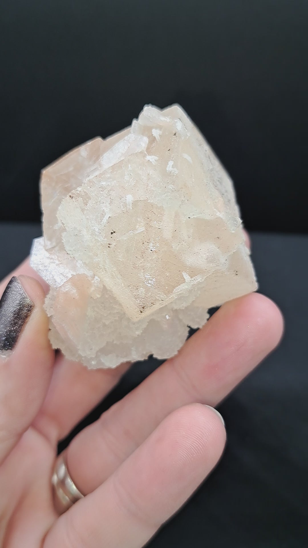 Super unique twinned golden calcite cube with stilbite accents and baby apophyllite drusy. Part of the calcite is exposed and glossy, part has a fine secondary drusy coating. Looks great on the small specimen stand (sold separately). Approx 2”. From Maharashtra, India.
